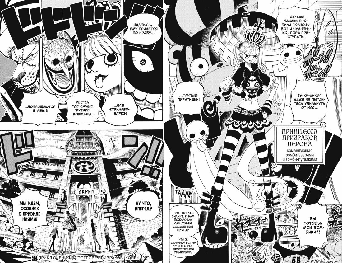 Путешествие Луффи и его соратников продолжается! Освободив Нико Робин из плена СП9, пиратская шайка вновь отправляется в плавание: их следующая остановка – остров Рыболюдей. Однако в море экипаж встречает непогода, и корабль заносит в загадочный Флорианский Треугольник, дьявольские воды, о которых ходит множество жутких легенд. И здесь на пути у команды Соломенной Шляпы возникает Триллер-Барк, плавучий остров призраков