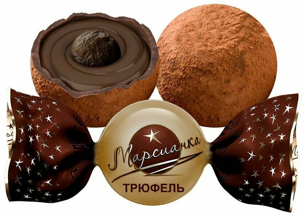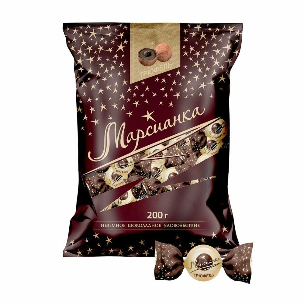 Конфеты Марсианка - Трюфель: насладитесь нежным угощением с кремовой начинкой, которая прекрасно дополнена посыпкой из какао-порошка. Каждая конфета в индивидуальной упаковке. Масса нетто: 200 г.