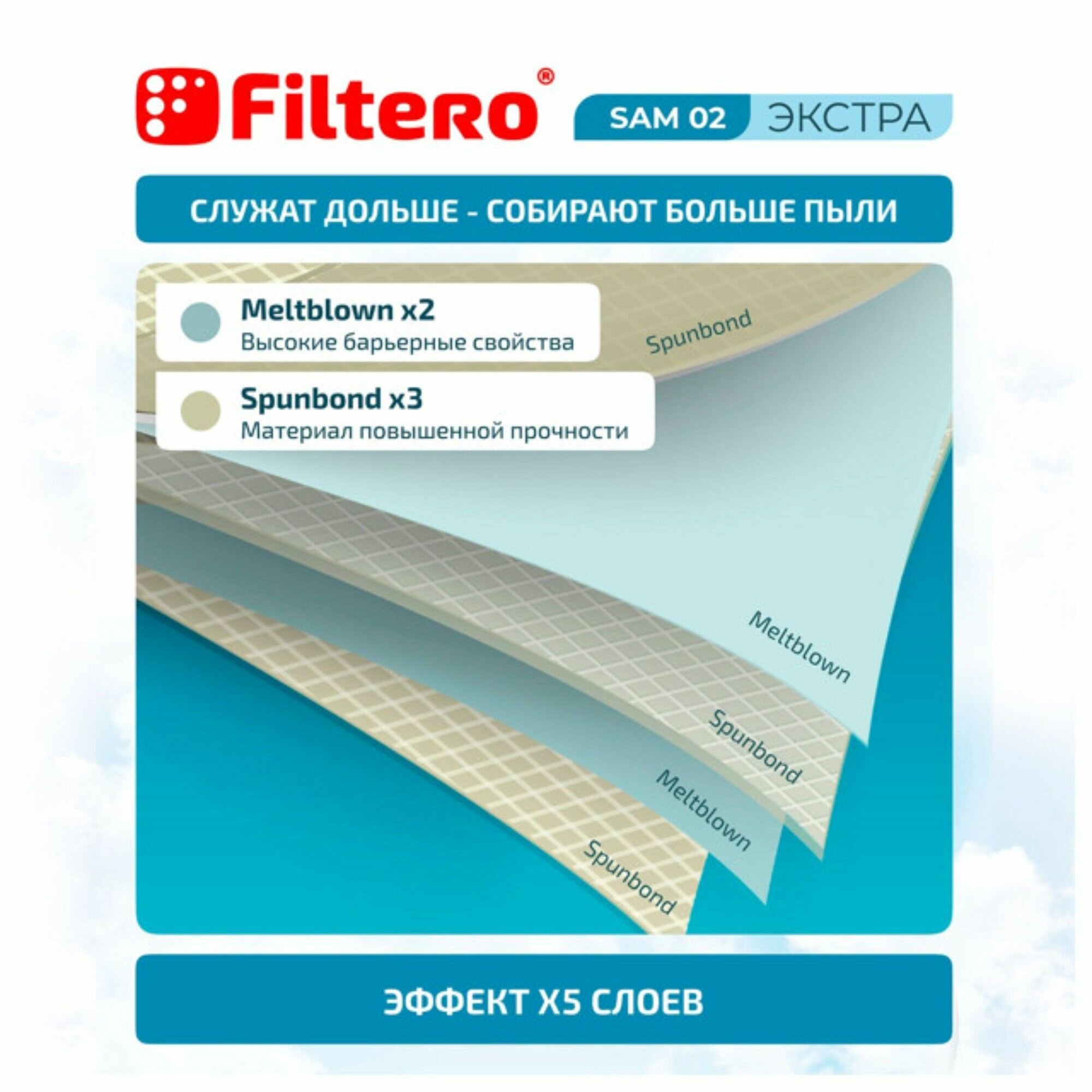 Пылесборники Filtero Comfort произведены из 5-тислойного синтетического микроволокна. В отличие от бумажных мешков, Filtero Comfort не рвутся, не боятся острых предметов и влаги, собирают большепыли (до 50 %). Filtero Comfortо беспечивают уровень очистки воздуха 99 %, что выше, чем у бумажных пылесборников, при этом сохраняя высокую мощность всасывания пылесоса в течение всего периода службы пылесборника.