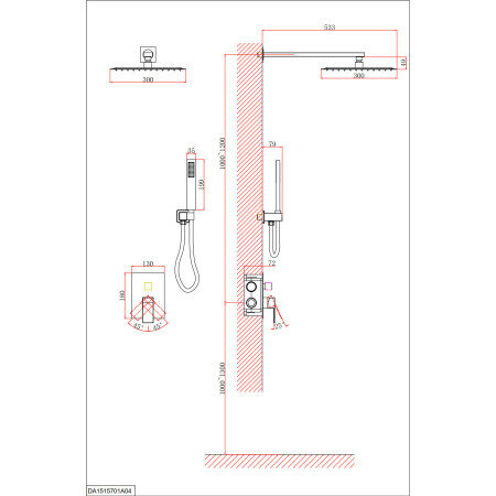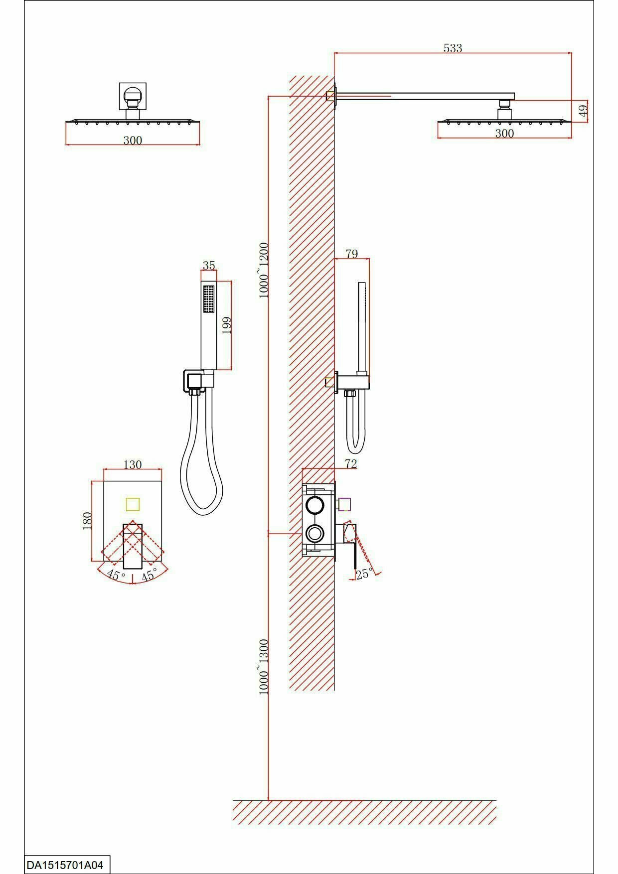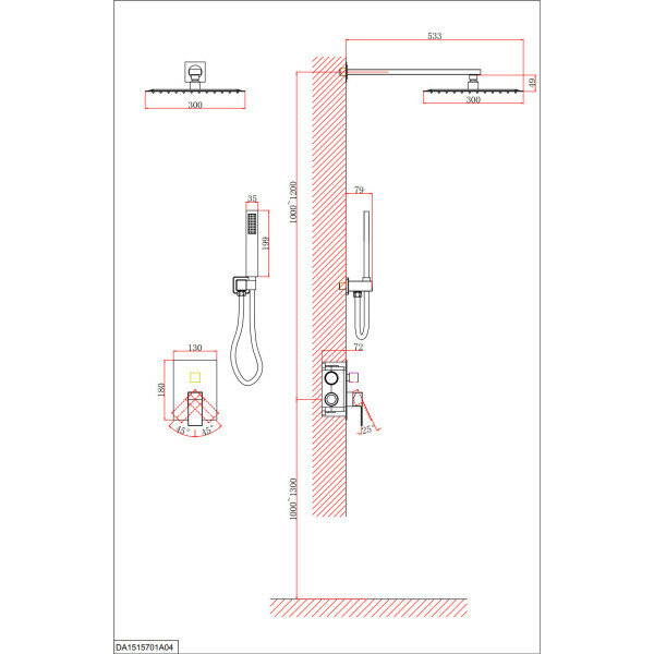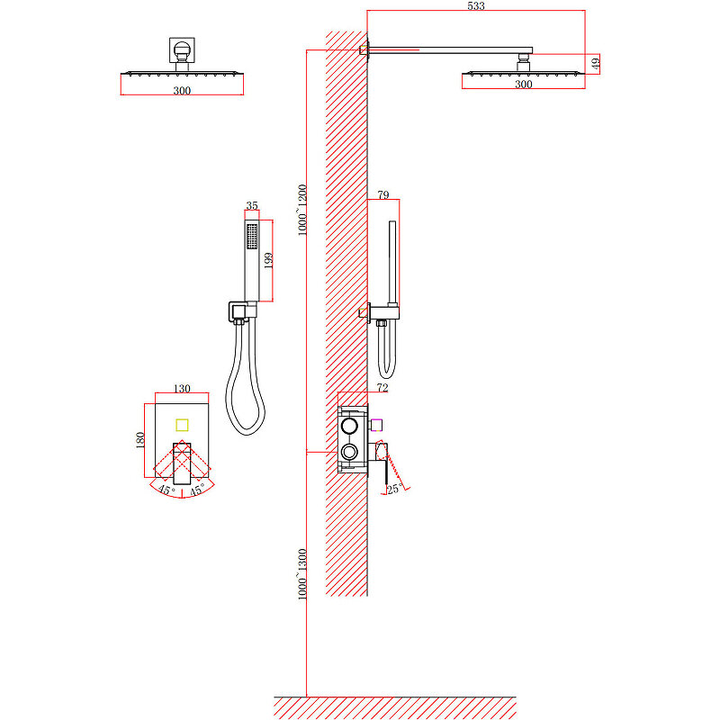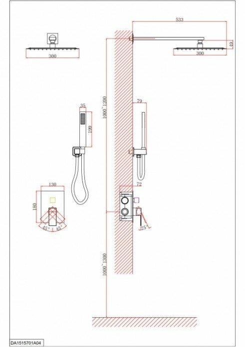 - Размер верхнего душа (ШxД): 300x300 мм.