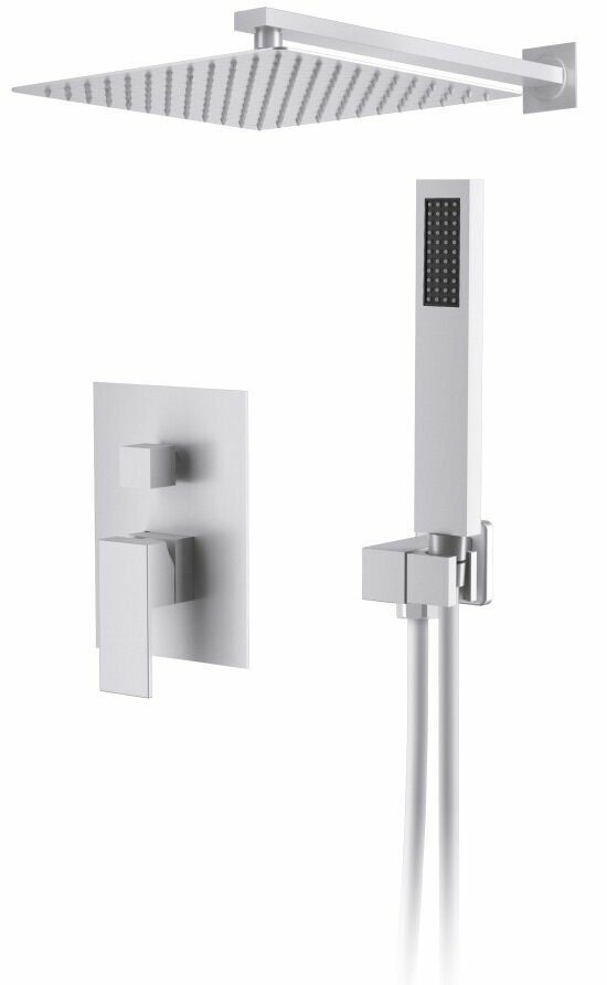 В комплект поставки входит: смеситель, встраиваемая часть: блок, держатель ручного душа, ручная лейка, держатель верхнего душа, тропический верхний душ, душевой шланг, паспорт