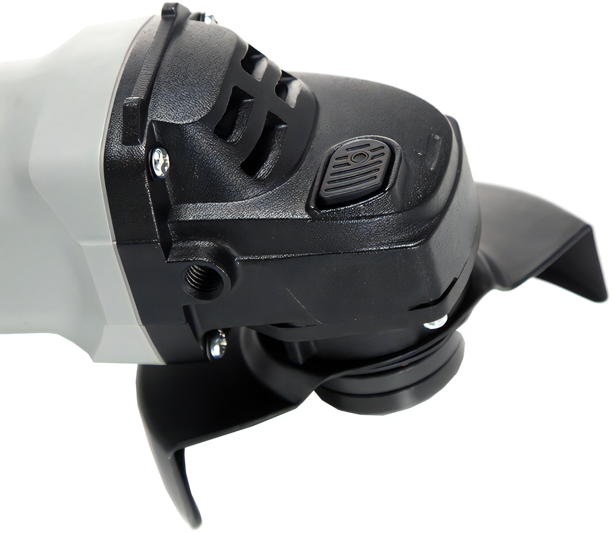 УШМ-115/900 имеет так называемую компоновку «хват рукой». Задняя часть корпуса заканчивается вместе с двигателем, а не продолжается рукояткой. Выключатель в виде ползунка смещен вперед к редуктору. Эти особенности позволяют держать "болгарку" одной правой рукой и при этом управлять выключателем при помощи большого пальца. Откровенно говоря, правила техники безопасности запрещают работу «одной правой», но бывают случаи, когда необходимость вынуждает. Вот именно при таких работах такая компоновка и будет наиболее удобной и безопасной. Во всех остальных случаях необходимо работать двуручным хватом, завинтив в одно из отверстий корпуса редуктора переднюю рукоятку. Заметим, что даже при работе двумя руками компоновка машин окажет положительное влияние: предельно малая длина позволит уверенно работать в стесненных условиях.