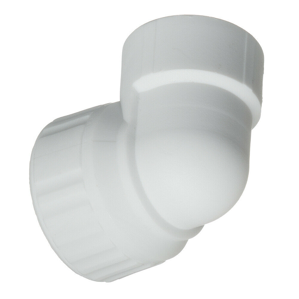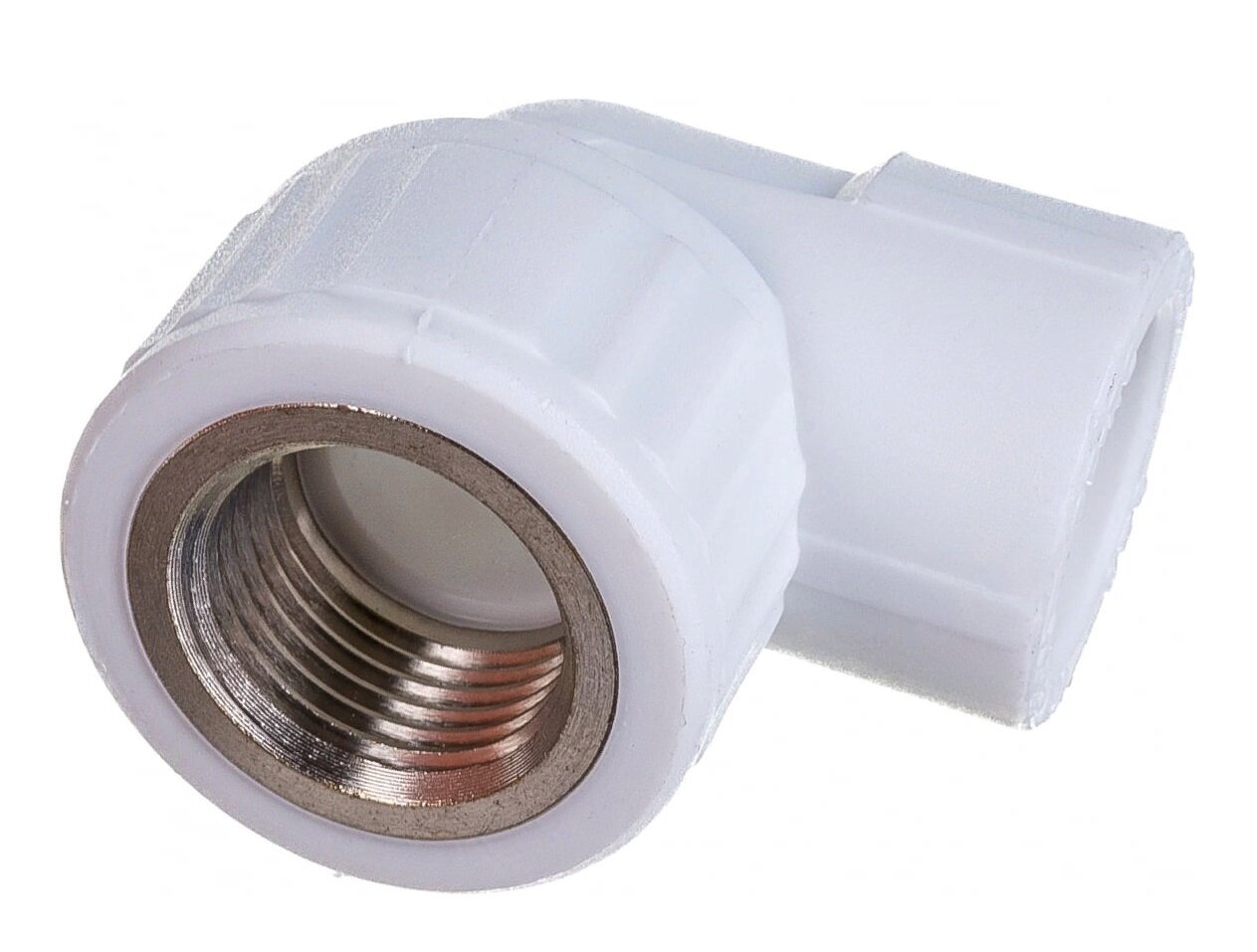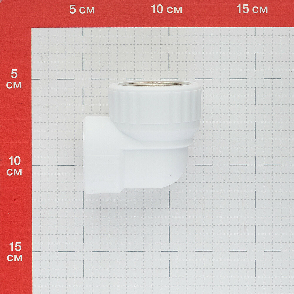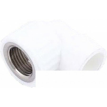 **Угол комбинированный** — полипропиленовый фитинг, который позволяет соединить трубы под углом 90°. Длина изделия 3,9 см, цвет — белый. Одно отверстие с резьбой размером 1/2" предназначено под металлическую трубу. Другое, с гладкой поверхностью, — под ПП трубу (входной диаметр — 20 мм). Соединение — внутреннее/под пайку. Фитинг применяется в системах с давлением до 25 бар и максимальной температурой 90 °C (горячее водоснабжение, система отопления и кондиционирования, питьевая вода).