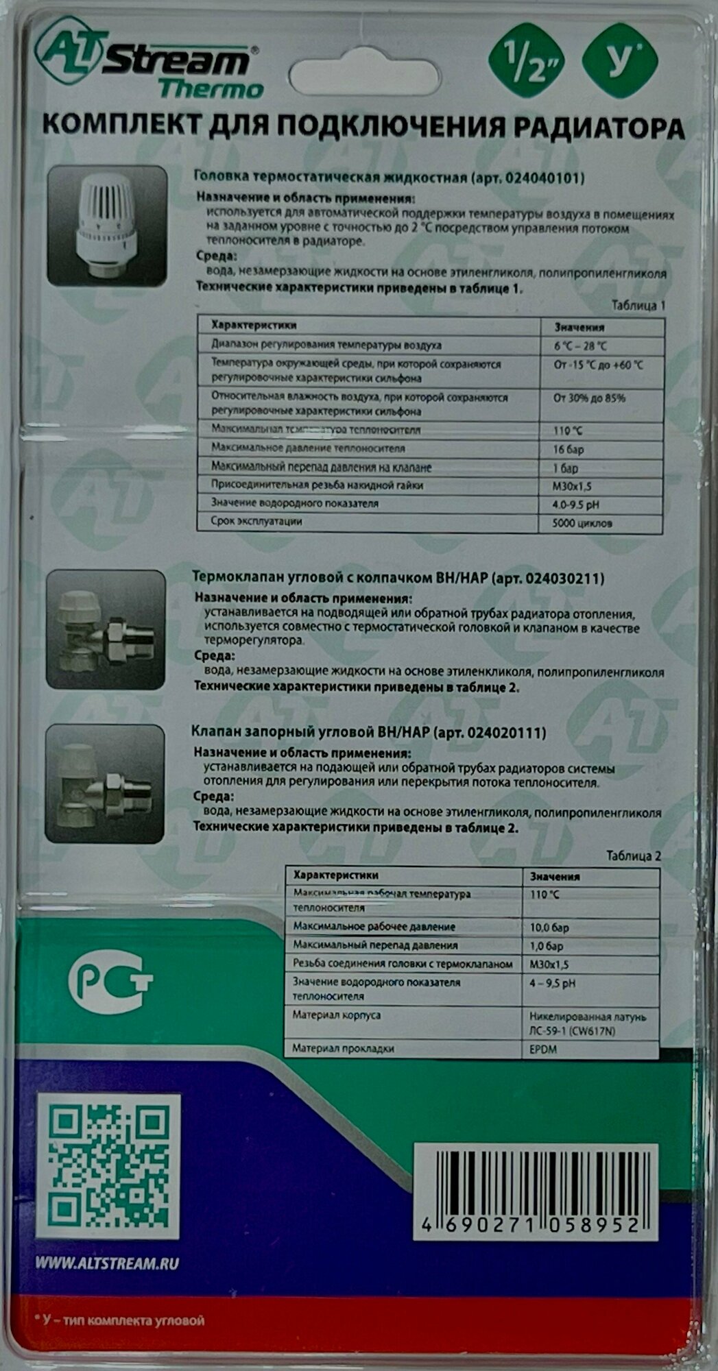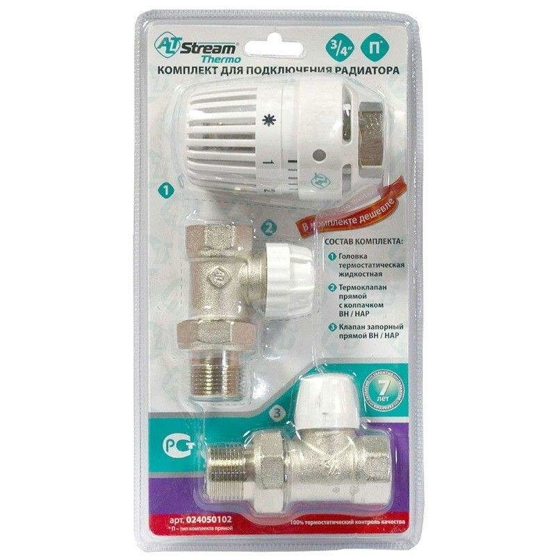 Комплект терморегулирующего оборудования включает в себя прямые термостатический и запорно-регулировочный (настроечный) радиаторные клапаны, а также термостатическую головку. Набор предназначен для бокового подключения прибора водяного отопления, автоматического регулирования расхода теплоносителя через него в зависимости от температуры воздуха в помещении, гидравлической балансировки системы отопления. Клапаны выполнены из качественной сантехнической латуни с гальваническим покрытием и оснащены самоуплотняющимися полусгонами. Комплект помещен в пылевлагозащитную упаковку (блистер). Стоимость данного комплекта меньше, чем при раздельной покупке входящих в него элементов. Головка термостатическая жидкостная: Диапазон регулировки температуры воздуха (°C): 6-28; Температура окружающей среды, при которой сохраняются регулировочные характеристики сильфона: От -15 до +60 °C; Относительная влажность воздуха, при которой сохраняются регулировочные характеристики сильфона: От 30% до 85%; Максимальная температура теплоносителя: 110°C; Максимальное давление теплоносителя: 16 бар; Термостатический клапан с колпачком прямой 3/4, Клапан запорно-регулирующий прямой 3/4 Максимальная температура теплоносителя: 110°C; Максимальное рабочее давление: 10бар; Максимальный перепад давления: 1,0 бар; Материал корпуса: Никелированная латунь ЛС-59-1 (CW617N)