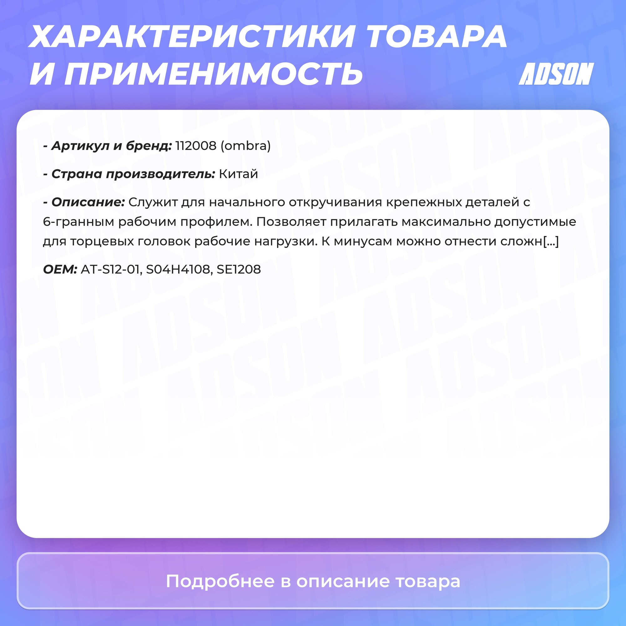 Торцевая головка 112008 Ombra применяется с гайковертами. Приспособление используется для откручивания различного крепежа, к которому относятся гайки, болты и т.д. Оснастка просто незаменима в случаях, когда крепеж расположен в труднодосягаемом месте, где работа с гаечными ключами не удобна. Торцевые головки подходят для ударных нагрузок и обладают лучшим крутящим моментом по отношению к резьбе, чем другой подобный инструмент.Преимущества Материал оснастки хром-ванадиевая сталь, что обеспечивает ее высокую прочность и стойкость к нагрузкам и механическим воздействиям Еще одной особенностью торцевой головки является хромоникелевое покрытие, за счет которого с поверхности оснастки легко удаляются все видимые загрязнения и она не подвергается коррозии