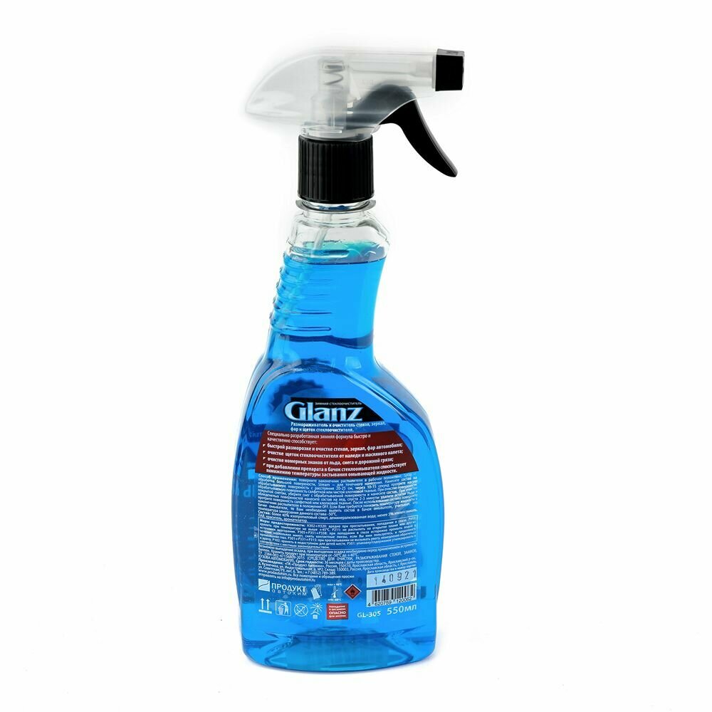 Размораживатель стекол Glanz 2в1 -50 С эффективно удаляет наледь, солевые отложения, грязь и масляную пленку. Продукт широко используют для очищения автомобильных стекол, фар, зеркал и щеток. Состав безопасен для лакокрасочного покрытия кузова, резины, пластика и металла.