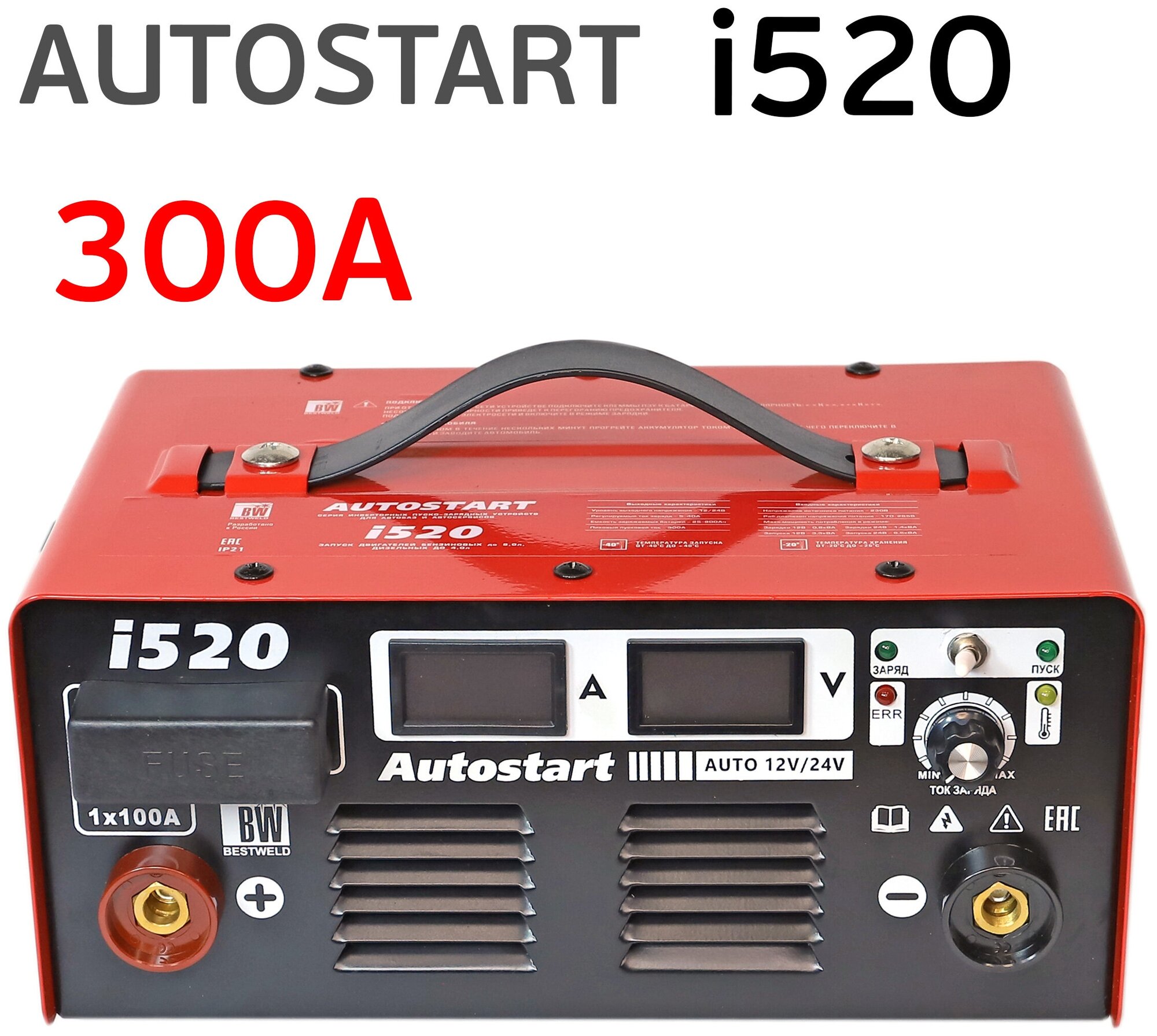 Инверторное пуско-зарядное устройство BestWeld AUTOSTART i520 BW1640 со съемными клеммами по новейшей инверторной технологии с автоматизириванным циклом зарядки. Ток заряда регулируется специальной ручкой и отображается на дисплее, что позволяет выставить точный показатель. Отдельный дисплей также показывает напряжение, которое устройство точно определяет и выбирает автоматически - 12/24 В.Устройство оснащено мощным вентилятором и защитой от перегрева, прокручивать стартер способно до 20 секунд.В устройстве присутствует предохранитель, который защищает при неправильном подключении полярности.Преимущества Компактные размеры Высокое качество сборки Долгий срок службы