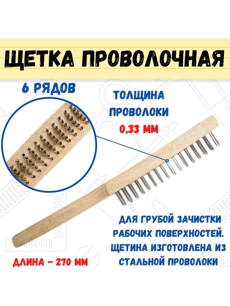 Щетка проволочная РемоКолор используется для грубой зачистки рабочих поверхностей. Щетина изготовлена из стальной проволоки и надежно закреплена в основании щетки. Толщина проволоки 0,33 мм. Длина щетки 270 мм.