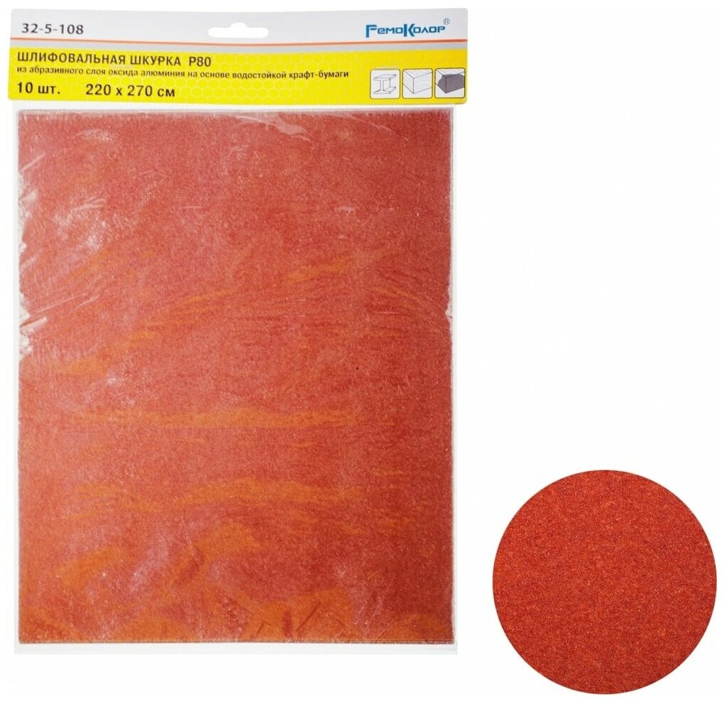 Сервис сравнения цен СкидкаГИД предлагает сравнить цены на товар «Шлифовальный лист на бумажной основе оксид алюминия водостойкий РемоКолор 32-5-108 Р80 220х270мм 10шт.»