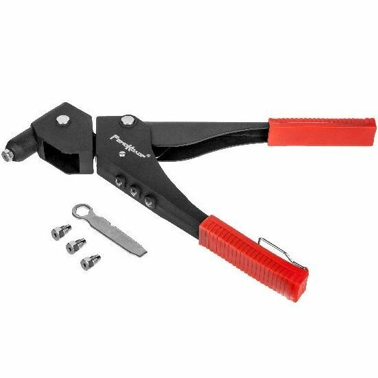 Заклепочник изготовлен из конструкционной стали. Имеет функцию перестановки головки для работы под углом от 0 до 360 градусов. Предназначен для установки алюминиевых заклепок в труднодоступных местах при скреплении заготовок и деталей. Заклёпочник механический с насадками для заклепок диаметром 2,4 мм, 3,2 мм, 4 мм, 4,8 мм. Стальной штампованный рычаг, пластиковые рукоятки. Длина: 230 мм. Материал: Металл, пластик. Корпус штампованный. Тип: механический поворотный на 3600. Заклепочник оснащен ПВХ рукоятками с местом для крепления ключа для замены насадок.