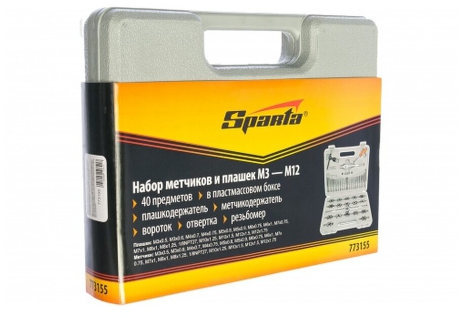 Набор метчиков и плашек SPARTA 773155 предназначен для нарезания внешних и внутренних резьб. Состоит из 40 предметов и включает в себя метчики, плашки (М3-М12), плашкодержатели и воротки для метчиков. Принадлежности отличаются высокой прочностью, износостойкостью и устойчивостью к повышенным нагрузкам. Пластиковый кейс облегчает переноску и обеспечивает удобное хранение инструментов.Преимущества Плашки - служат для нарезания внешней метрической резьбы с мелким и стандартным шагом Метчики - предназначены для нарезания внутренней метрической резьбы с мелким и стандартным шагом в глухих или сквозных отверстиях Метчикодержатель с регулируемым винтовым механизмом применяется для надежной фиксации метчиков Плашкодержатель со стопорными винтами обеспечивает стойкую фиксацию и центровку плашки Т-образный держатель для метчиков с фиксированным зажимным патроном отлично подходит для создания резьбы в труднодоступных местах Отвертка в комплекте для монтажа и демонтажа резьбовых соединений Резьбомер используется для определения шага метрической резьбы