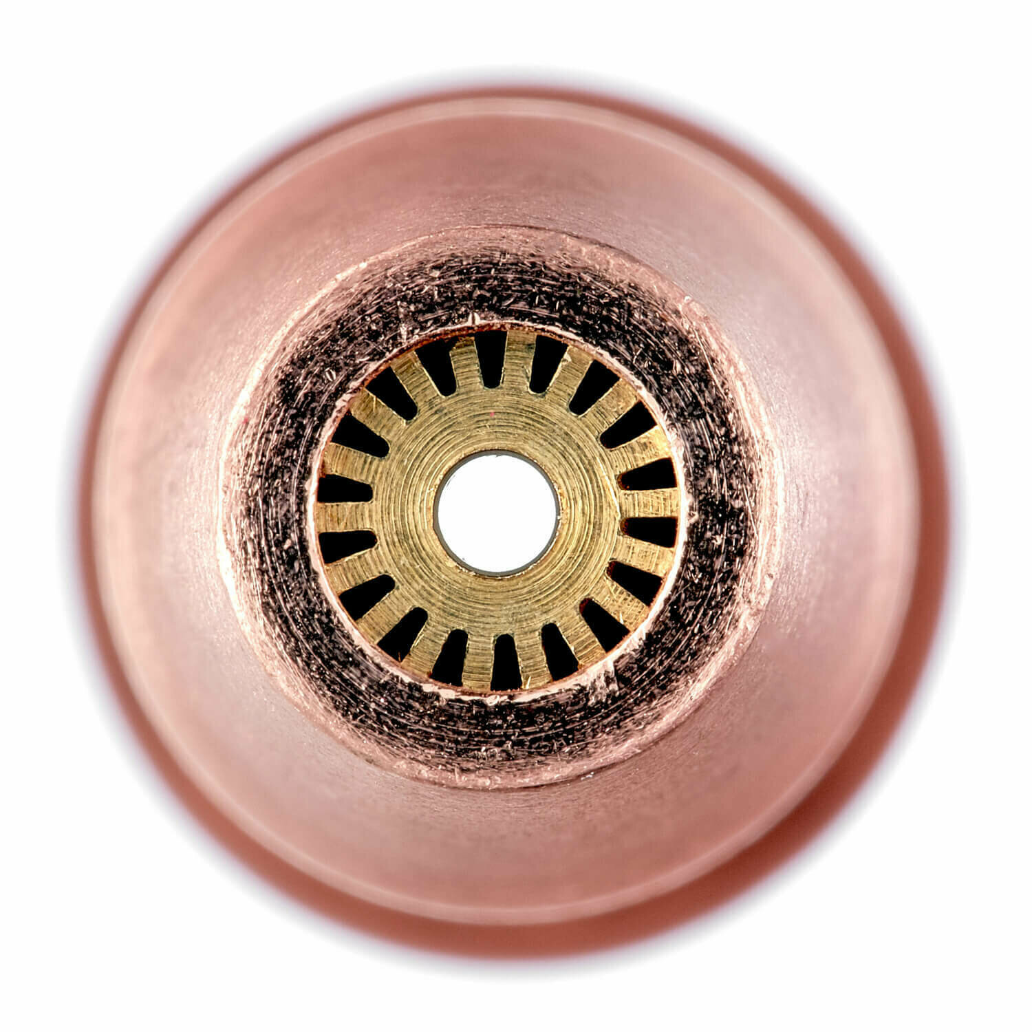 Разборный пропановый мундштук №3PM ПТК020.120.018 к 3-х трубным резакам внутрисоплового смешения газов Р3-300 и Р3-345. Толщина разрезаемого металла 30–50 мм. Газосмесительный мундштук имеет три запорных пояска, которые предотвращают перетечку газов и обеспечивают смешение газов непосредственно в мундштуке, обеспечивая безопасное использование.Мундштук является основной частью резака, который в процессе резки довольно быстро поддается изнашиванию. Для правильной работы необходимо знать верные размеры каналов подбираемого мундштука.Преимущества Конструкция мундштука позволяет рассеивать пламя и равномерно прогревать металл для комфортного реза Надежность и долговечность