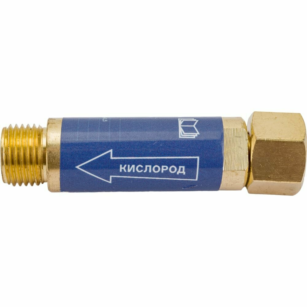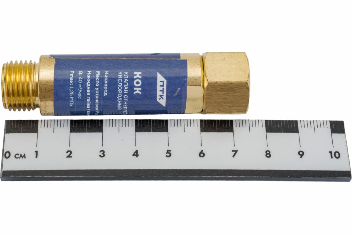 Клапан кислородный огнепреградительный для газопламенной обработки металлов. Устанавливается на редуктор. Присоединение — накидная гайка/входная резьба М16х1. Клапан огнепреградительный кислородный КОК (на редуктор) М16х1,5 предназначен для защиты от противотока газа, а также для защиты от разрыва кислородного резинотканевого рукава и его возгорания при обратном ударе пламени.Преимущества Задержка противотока газа при давлении от 0,03 кгс/см2и более Направление истечения газа указано стрелкой на наклейке