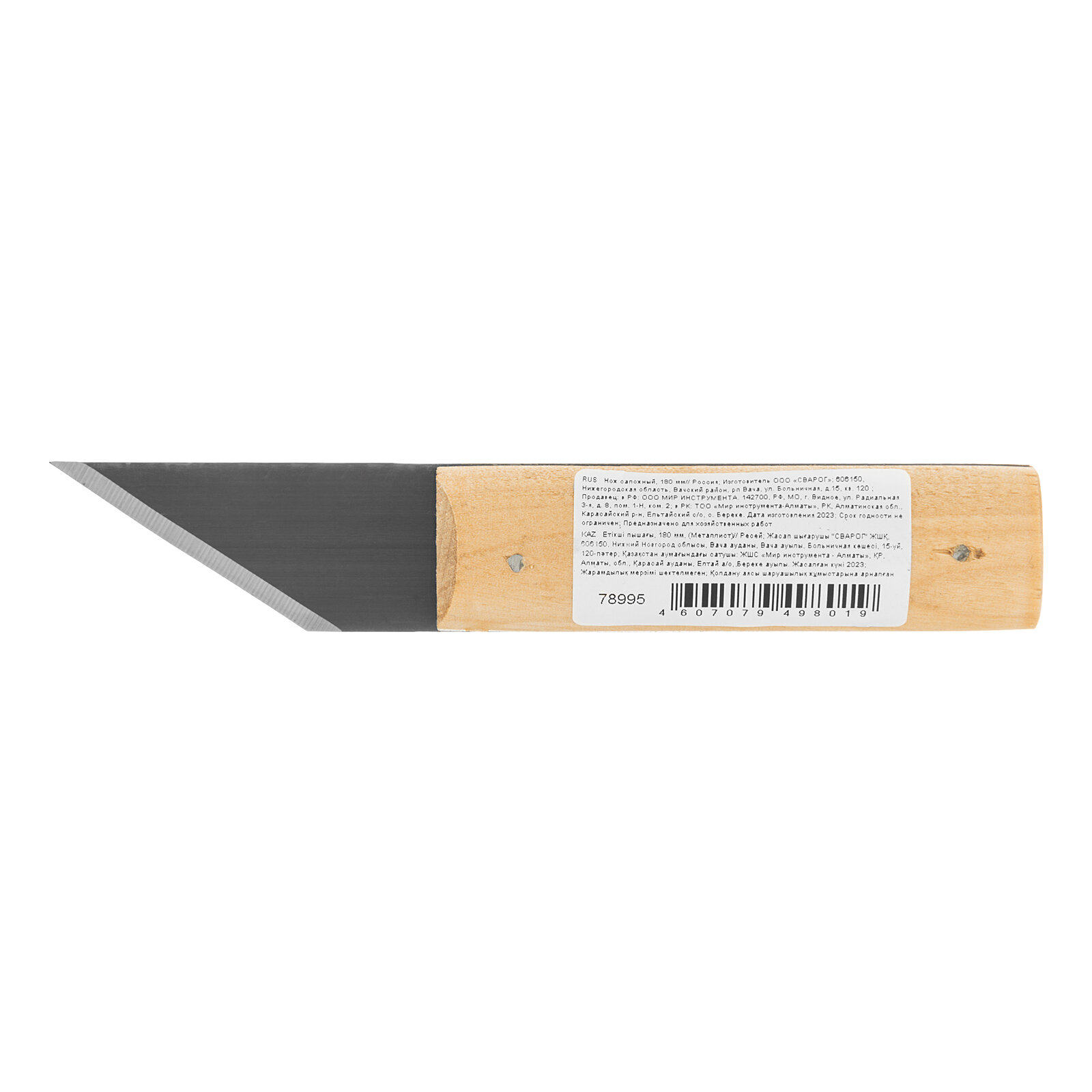 Сапожный нож 180мм Россия 78995 представляет собой сочетание деревянной ручки и лезвия из углеродистой стали. Инструмент имеет компактные размеры, очень удобен в эксплуатации. Подходит для профессиональных работ в обувных мастерских.Преимущества Сталь У8А, из которой изготовлено лезвие, придает ему высокую прочность и твердость Деревянная ручка приятна на ощупь и удобно лежит в руке, поэтому с ножом комфортно работать Небольшой вес ножа 87 г позволяет работать на протяжении длительного времени без усталости