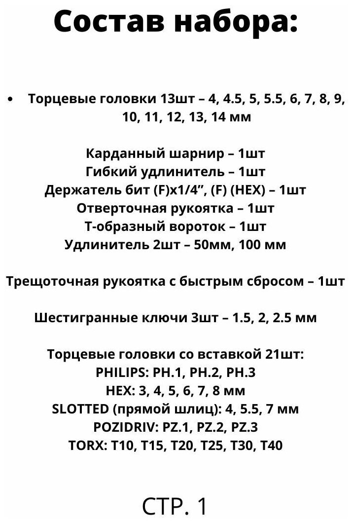 | Комплектация | головка-бита; трещотка реверсивная; отвертка-вороток; вороток т-образный; удлинители; удлинитель гибкий; кардан шарнирный; шестигранные ключи г-образные |