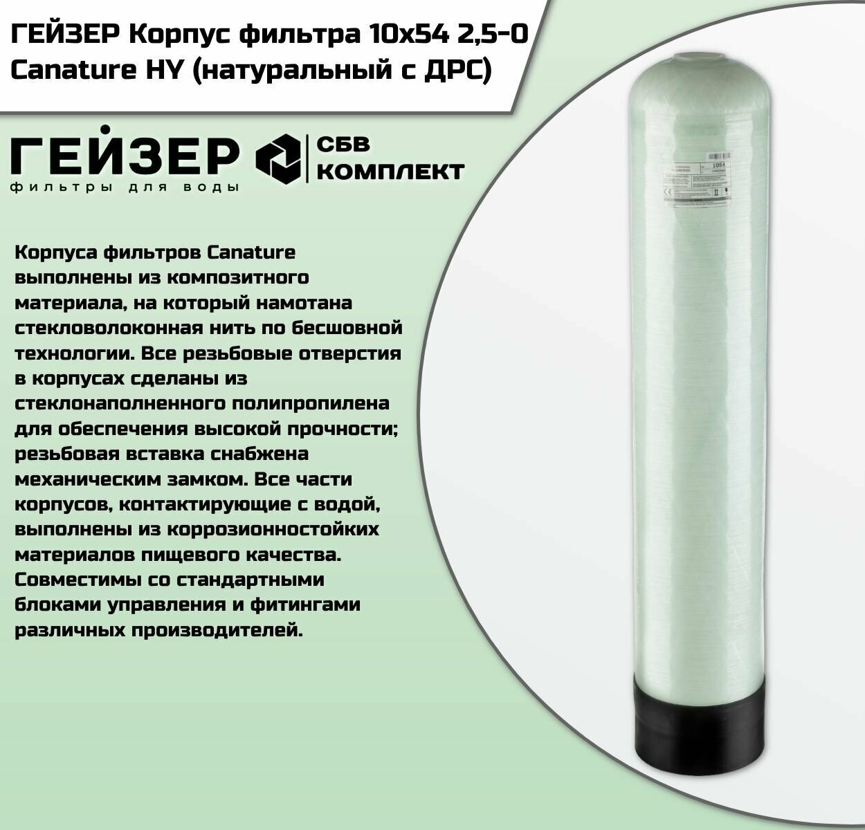 Корпус фильтра ГейзерCanature предназначен для скорого фильтра с зернистой загрузкой.Преимущества Изготовлен по технологии выдувания, что исключает наличие швов, и состоит из композитного материала, устойчивого к химическим реагентам Корпус армирован стекловолоконной нитью Резьбовые отверстия обладают высокой прочностью и изготовлены из стеклонаполненного полипропилена Резьбовая вставка снабжена механическим замком Отвечает всем стандартам FDA по питьевой воде, сертифицирован (Ростест, NSF, PED)