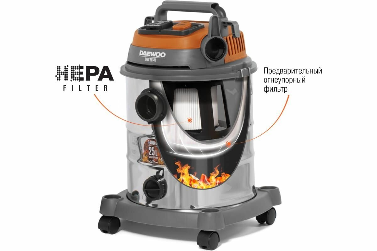 Пылесос промышленный Daewoo DAVC 2514S нерж. бак огнеупорные шланг и фильтр выдув 1400 Вт.