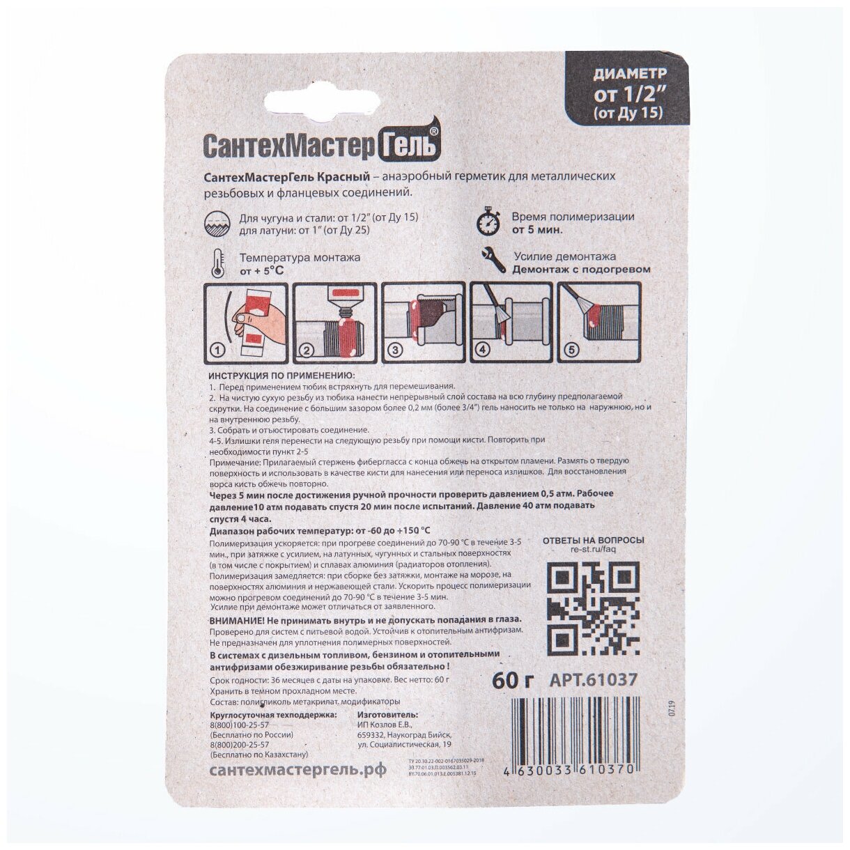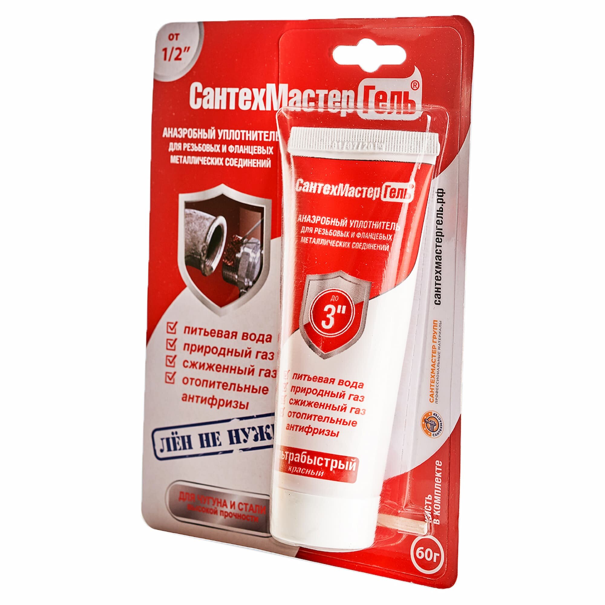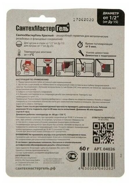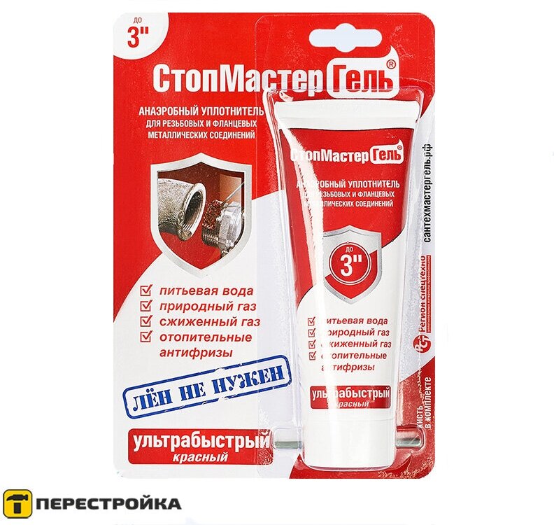 Гель Сантехмастер , тюбик 60г - используют для герметизации и фиксации резьбовых соединений диаметром от 1/2" до 3". Анаэробный состав полимеризуется уже через 5 минут в зазорах между поверхностями без доступа воздуха.Преимущества Продукт предотвращает образование коррозии и самораскручивание деталей за счет увеличения момента страгивания Фиксатор наносят при температуре не ниже +5С Демонтаж конструкции производят с дополнительным нагревом Области применения: питьевая вода, природный газ, сжиженный газ, сжатый воздух, отопительные антифризы, дизельное топливо, бензин