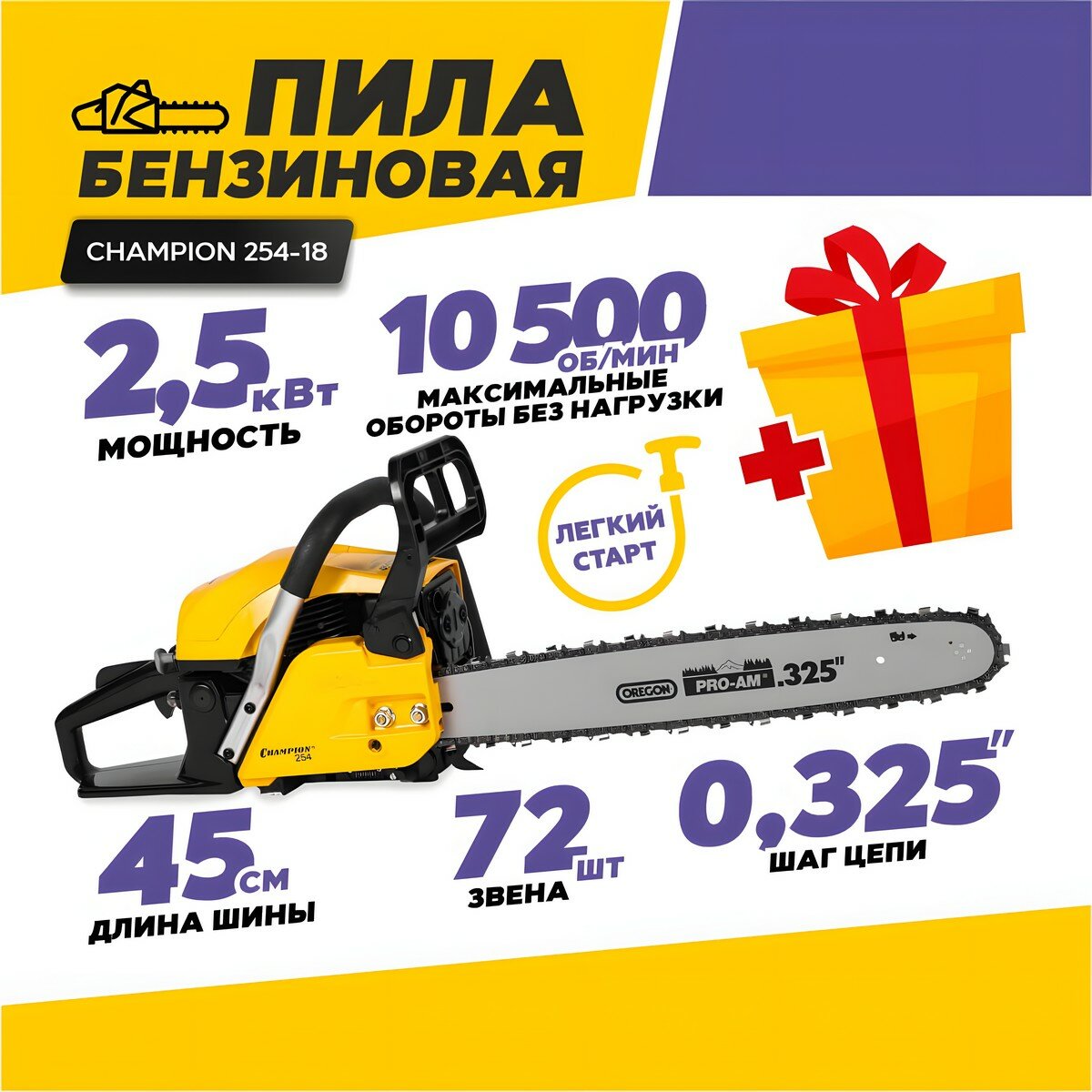 Бензопила Champion 254-18"-0,325-1,5-72 A254-18 - универсальная пила для строительства, заготовки дров и работы по валки леса. Оснащена высокопроизводительным бензиновым двигателем мощностью 3.4 л.с., который обеспечивает интенсивную, надежную и долговечную работу инструмента. Имеет заслонку "зима-лето" для обогрева воздушного фильтра и карбюратора в холодное время года. Оборудована уловителем цепи, рычагом тормоза и блокиратором курка газа, что повышает безопасность использования.Преимущества Ручной стартер с системой запуска "Легкий старт" Облегченный доступ к воздушному фильтру Электронное зажигание - для облегчения запуска Уловитель цепи делает работу более безопасной Регулируемый карбюратор - для настройки работы двигателя в различных климатических условиях Зубчатый упор Передний щиток - для защиты руки Регулируемая автоматическая система подачи масла к шине и цепи Используемое топливо: смесь бензина и масла для двухтактных двигателей