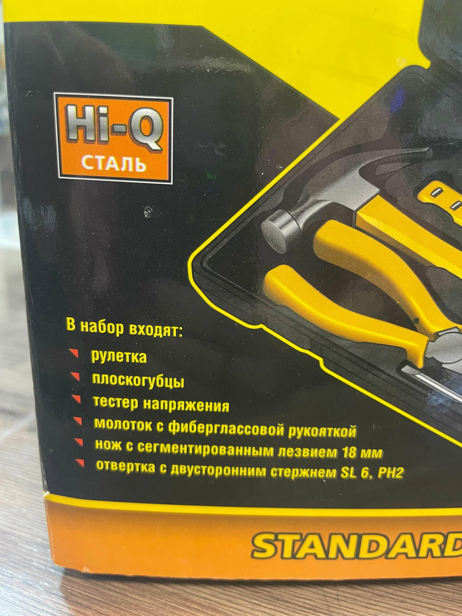 | Подробный состав комплекта | Молоток с фиберглассовой рукояткой, плоскогубцы, отвертка с двусторонним стержнем SL 6, PH2, рулетка, нож с сегментированным лезвием 18 мм, тестер напряжения |