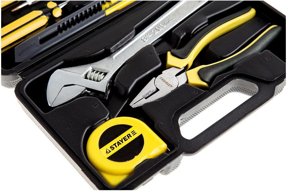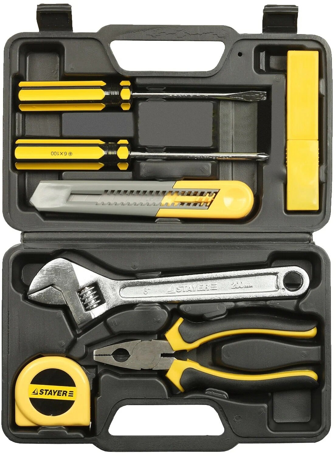 Набор инструментов STAYER для проведения ремонтных и обслуживающих работ. Состоит из восьми предметов: плоскогубцев, отверток SL 6 и PH 2, разводного ключа с регулировкой зева до 25 мм, рулетки, индикаторной отвертки, сегментированного ножа c лезвием 18 мм. B комплект входят десять лезвий 18 мм. Набор представлен в эргономичном пластиковом кейсе, оснащенном системой ложементов, которые надежно фиксируют инструмент и предотвращают его повреждение.