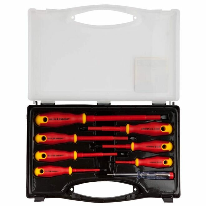 | Подробный состав комплекта | Отвертка SL 3 x 80 мм; Отвертка SL 4 х 100 мм; Отвертка SL 5 x 125 мм; Отвертка SL 7 x 150 мм; Отвертка PH №0 x 80 мм; Отвертка PH №1 x 100 мм; Отвертка PH №2 х 125 мм; Отвертка-тестер 100-250 В; Кейс. |