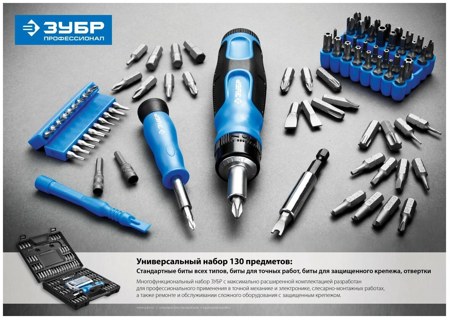 | Комплект поставки | Реверсивная отвертка с магнитным битодержателем и отсеком для бит, Биты 71 шт. - SL, PH, PZ, Hex, Hex Hole, Torx, Torx Hole, SQ, Clutch, Torq, Doubl pin (spanner), Triwing, Pentagonal, Адаптер для торцовых головок, Биты в боксе - 32 шт., Магнитный адаптер 60 мм, Отвертка с пружинным битодержателем и отсеком для бит, Биты 20 шт. - SL, PH, TX, TX Hole, Triwing, Pentagonal, Биты-торцовые головки 4, 5 мм, Съемник панелей, Пластиковый кейс |