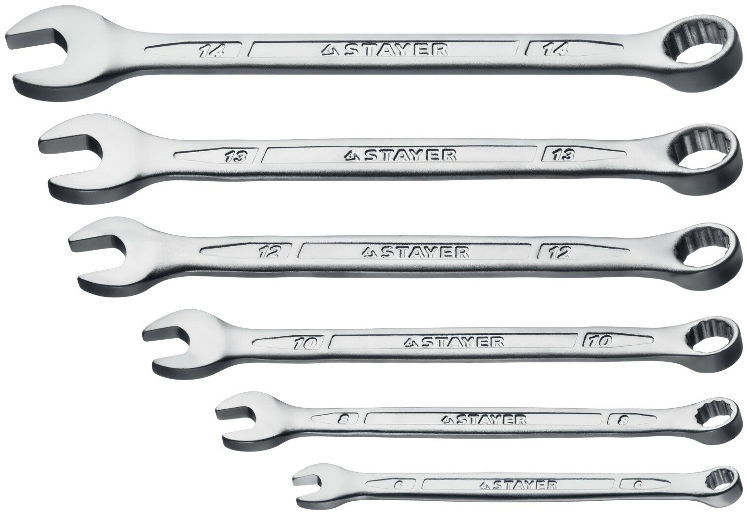 Набор комбинированных гаечных ключей 6-14мм, 6шт STAYER MASTER - комплект двусторонних ручных инструментов, который подходит для работы в автосервисе, гараже, слесарной мастерской, на производстве и т. д. Изделия выполнены из качественной стали, которая обеспечивает долгий срок службы. Преимущества набора гаечных комбинированных ключей STAYER MASTER Материал набора комбинированных гаечных ключей 6-14мм, 6шт STAYER MASTER - прочная и качественная Hi-Q сталь, Кованая конструкция, Соответствие международным и российским стандартам качества, Защитное хромированное покрытие.
