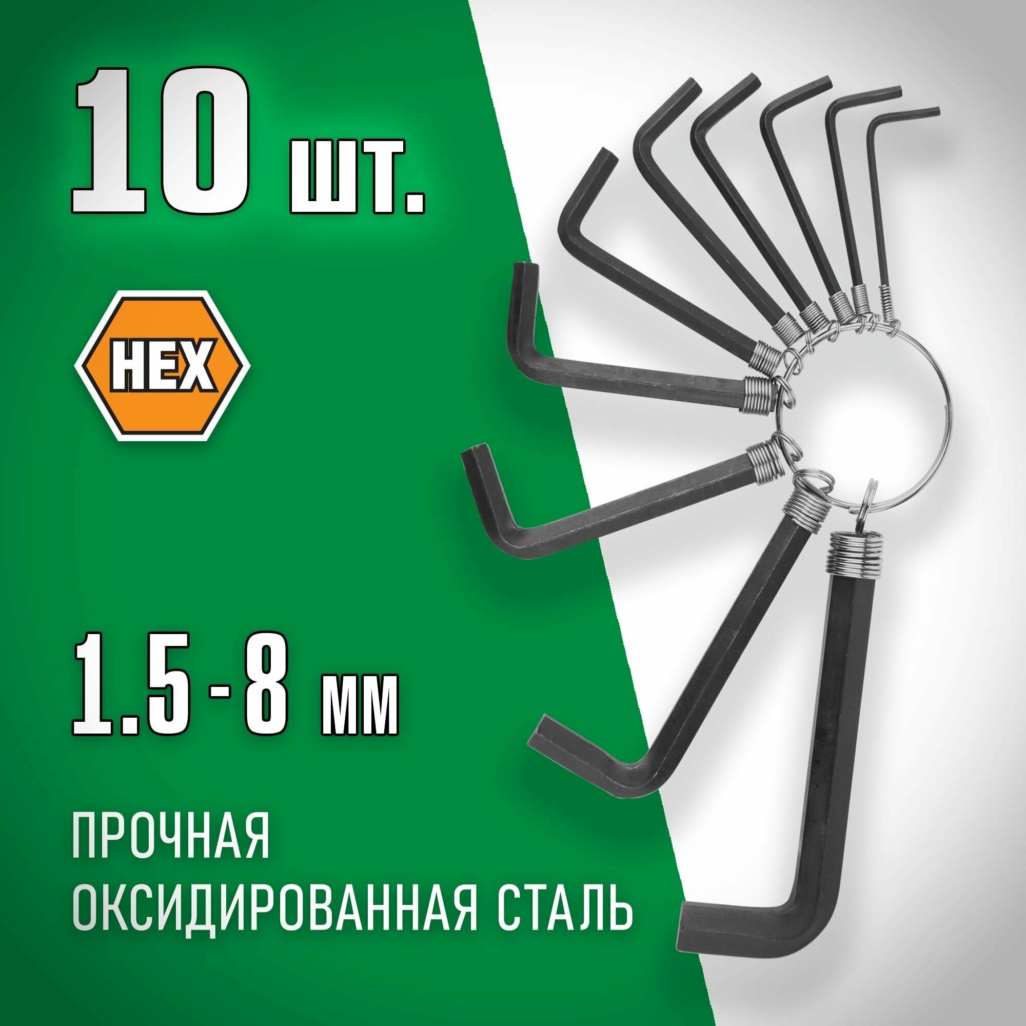 | Прочие особенности и свойства | Набор DEXX 27403-H10 оксидированные. на кольце. Размер:HEX. 1.5-2-2.5-3-3.5-4-5-5.5-6-8. Применяется для монтажных и демонтажных работ в машиностроении, автомобильной промышленности при работе с винтами и болтами. |