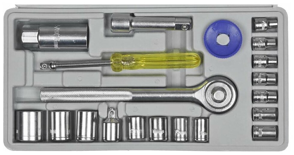 | Комплектация | Головки торцовые 1/4" (4, 4.5, 5, 5.5, 6, 7, 8, 9, 10, 11, 12 мм) - 11 шт;Головки торцовые 3/8" (13, 14, 17 мм) - 3 шт;Головка свечная 3/8" (16 мм);Трещотка 3/8";Вороток дисковый 3/8";Вороток-отвертка 1/4";Удлинитель 3/8" (70 мм);Переходник 3/8" F x 1/4" M;Пластиковый кейс. |