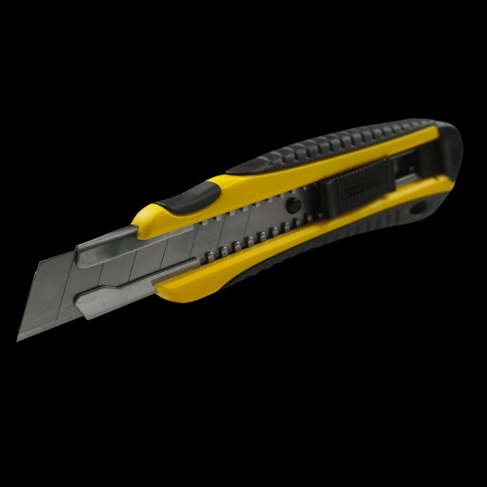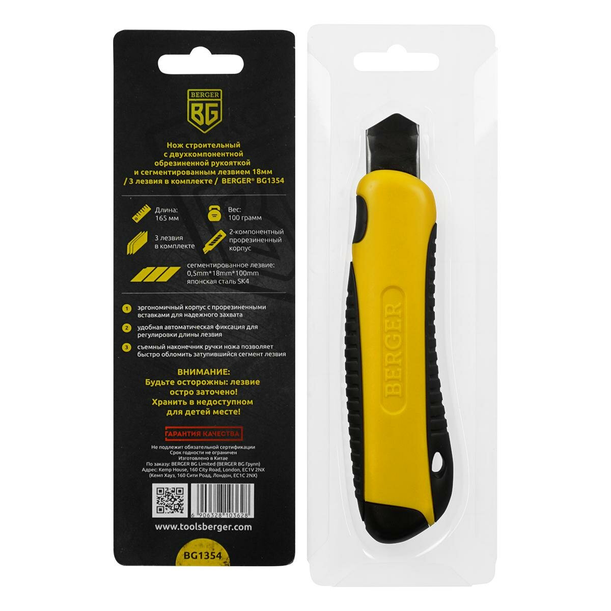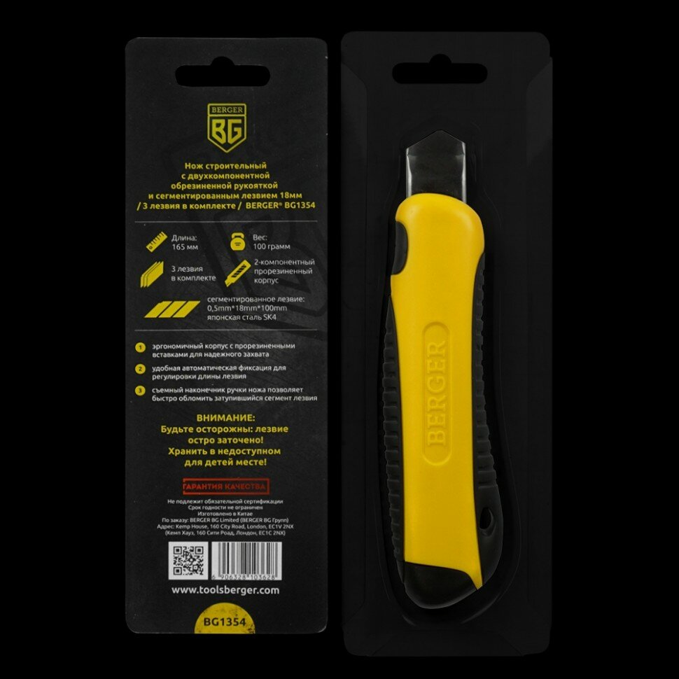Строительный нож Berger BG1354 18мм, с 3-мя лезвиями в комплекте - предназначен для работ как с плотными материалами, так и для работ с мягкими, например тканями. За счет выдвижной конструкции он удобен и безопасен в использовании. Инструмент применяется в различных сферах: на стройке, в офисе, в домашнем обиходе и частных мастерских.Преимущества Японская сталь SK4, благодаря которому лезвие долгое время сохраняет остроту заточки Эргономичный корпус с прорезиненными вставками для надежного захвата Удобная автоматическая фиксация для регулировки длины лезвия Съемный наконечник ручки ножа позволяет быстро обломить затупившийся сегмент лезвия