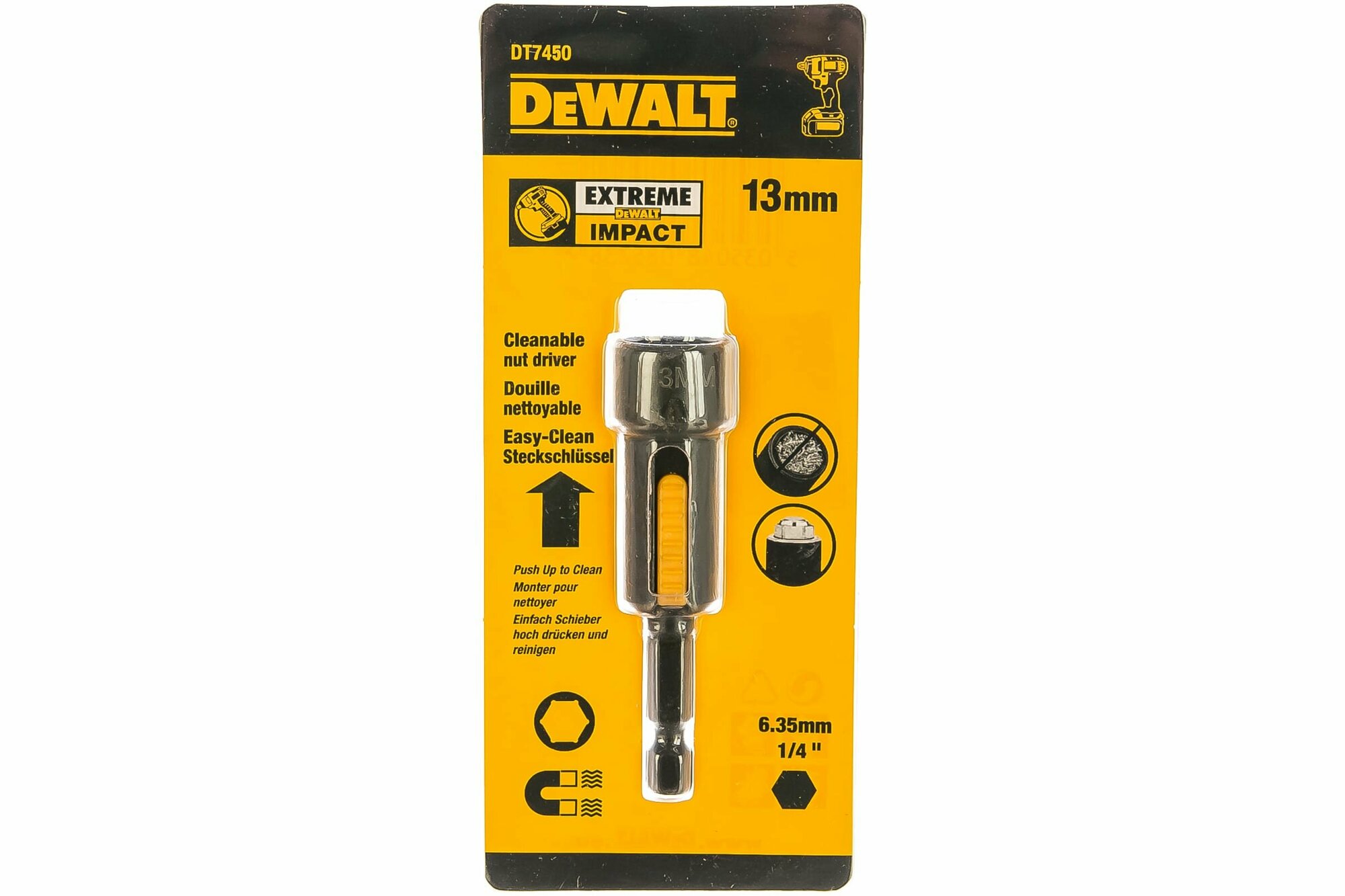 Торцевой ключ магнитный 13 мм, DEWALT IMPACT Easy Clean DT7450 отличается специальной системой Easy Clean, которая позволяет быстро очистить рабочую часть головки от намагниченной стружки.