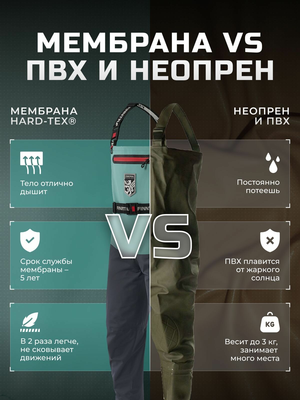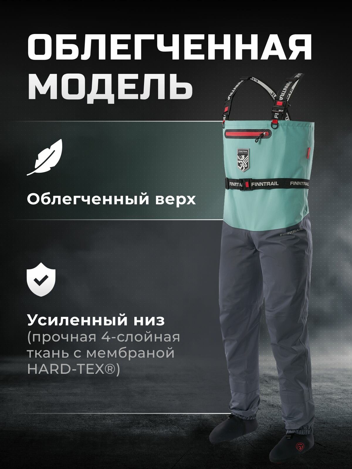 Меньше вес - меньше усталости с самыми легкими вейдерсами от FINNTRAIL. Показать еще Четырёхслойная ткань с мембраной HARD-TEX Износостойкий, дышащий материал надёжно защитит от ветра и влаги. Ткань сохраняет тепло и комфорт, выдерживая до 24 часов под проливным дождём. Teflon® Грязе-водоотталкивающее покрытие предотвратит впитывание вязкой грязи, не оставляя разводов. Артикулированный крой обеспечит полную свободу движений, а эластичный пояс и подтяжки легко отрегулируют вейдерсы по фигуре. Функциональный дизайн модели объединяет в себе продуманные детали и оригинальный цвет морской волны. Вместительный нагрудный карман на молнии YKK защитит ценные вещи от попадания влаги. Светоотражающие элементы 3M обеспечат безопасность в ночное время суток. D-образные кольца позволят закрепить необходимые инструменты, а внутренние петли надежно зафиксируют вейдерсы во время сушки. В каждый комплект входят водонепроницаемый чехол для смартфона и сумка для переноски.