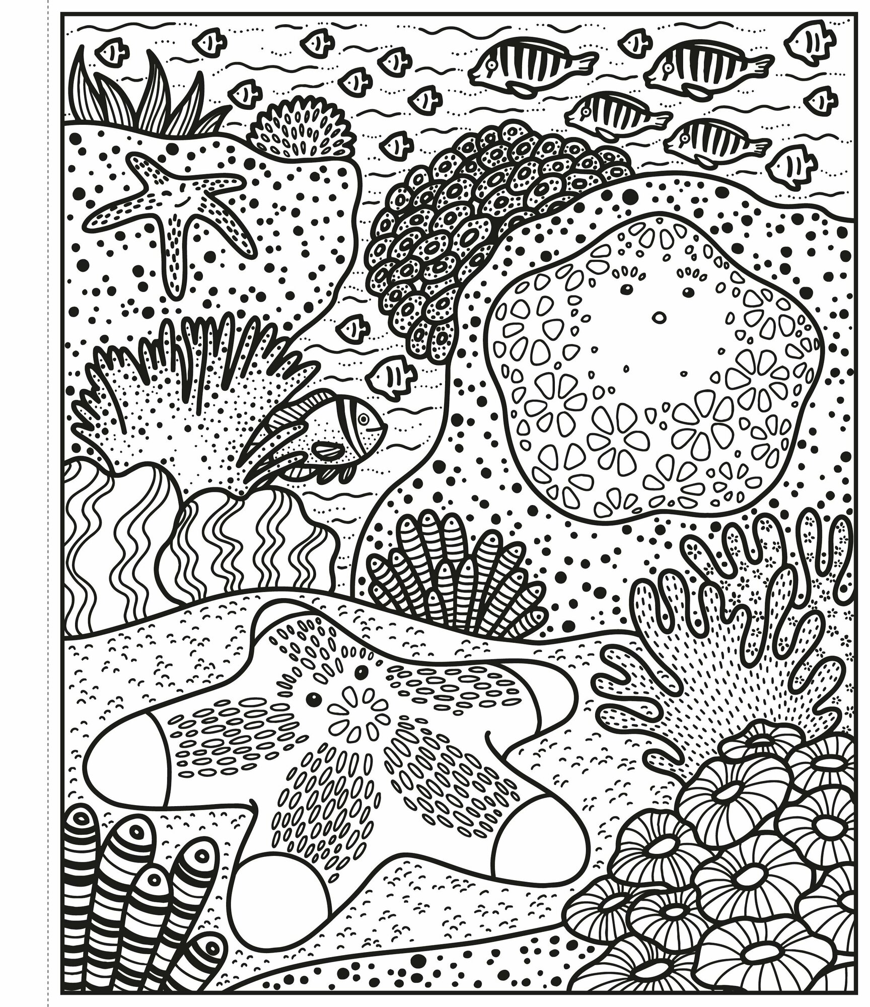 Packed with fascinating scenes showing fish, turtles and other sea creatures swimming among beautiful corals. Simply brush water over the black and white designs to reveal an array of glorious colours.