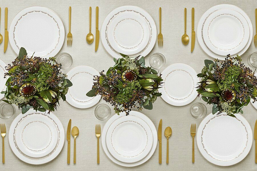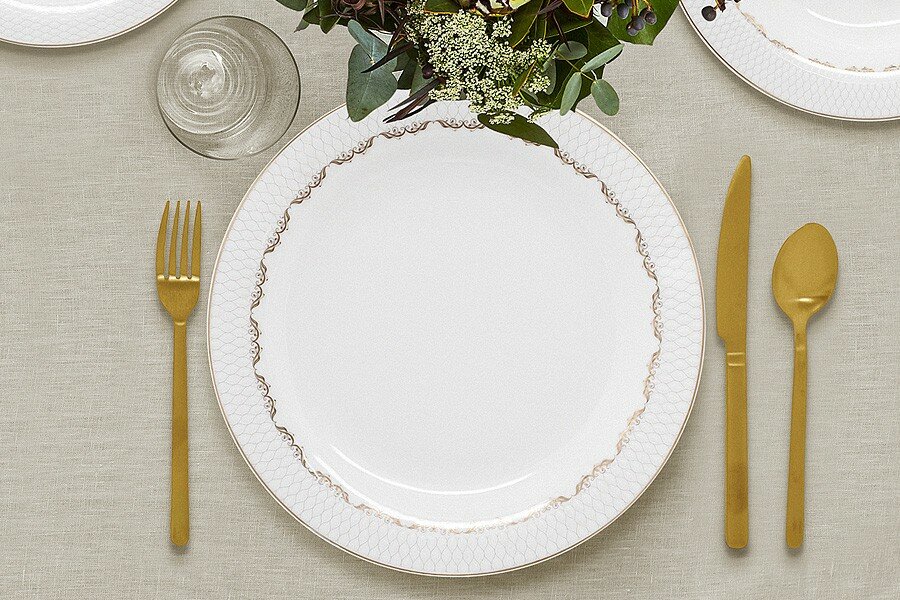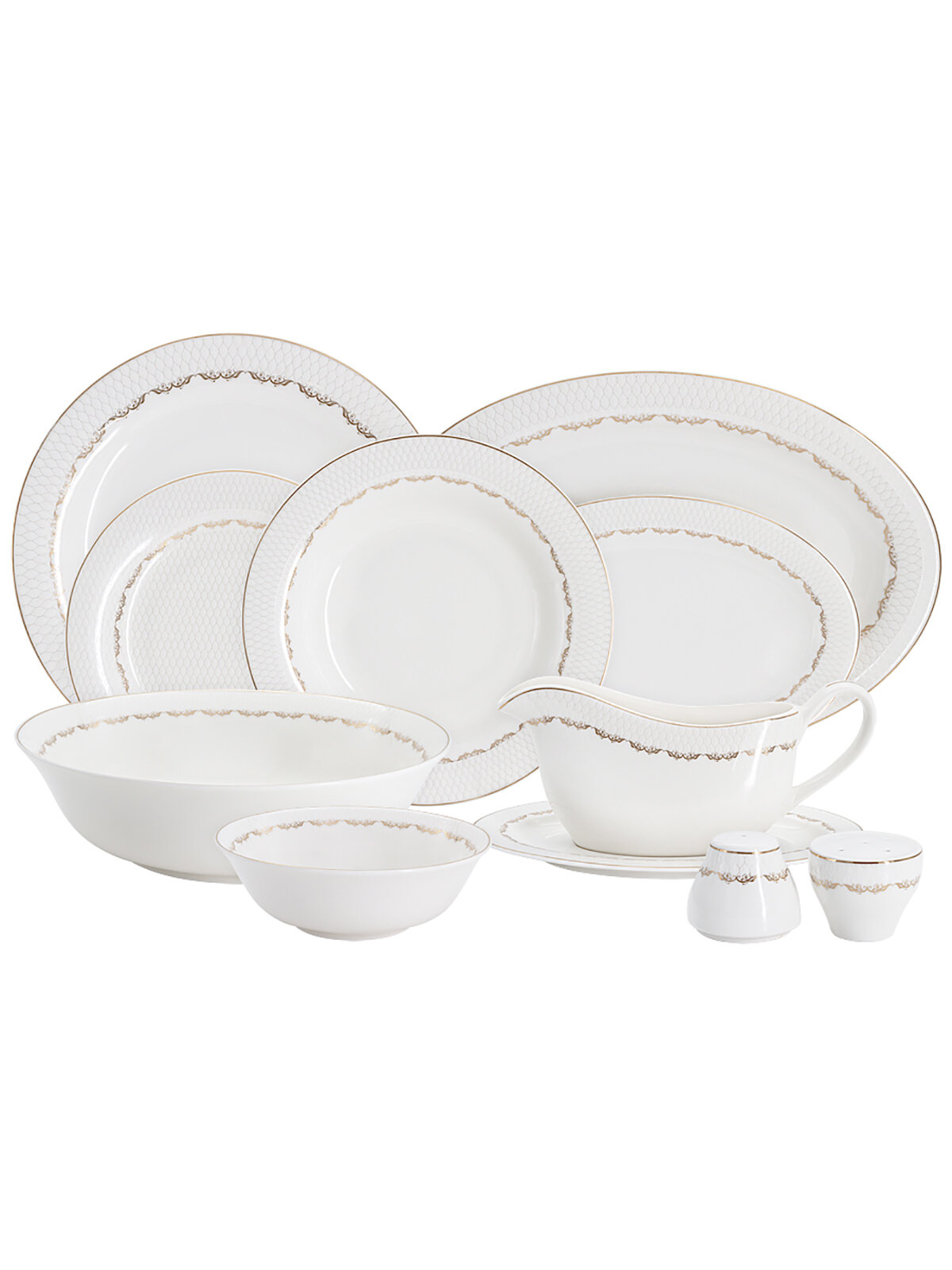 | Комплектация | Обеденная тарелок 27 см - 6 шт., закусочная тарелок 20 см - 6 шт., суповая тарелка 22,5 см 400 мл - 6 шт., салатник 22.5 см 1,7 л - 1 шт., салатник 15 см 450 мл - 2 шт., блюдо 36 см - 1 шт., блюдо 25 см - 1 шт., соусник 500 мл - 1 шт., блюдце для соусника - 1 шт., солонка - 1 шт., перечница - 1 шт. |