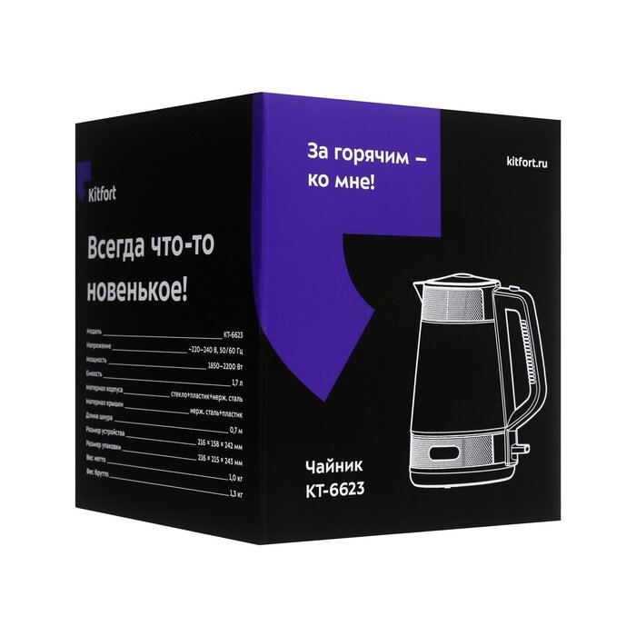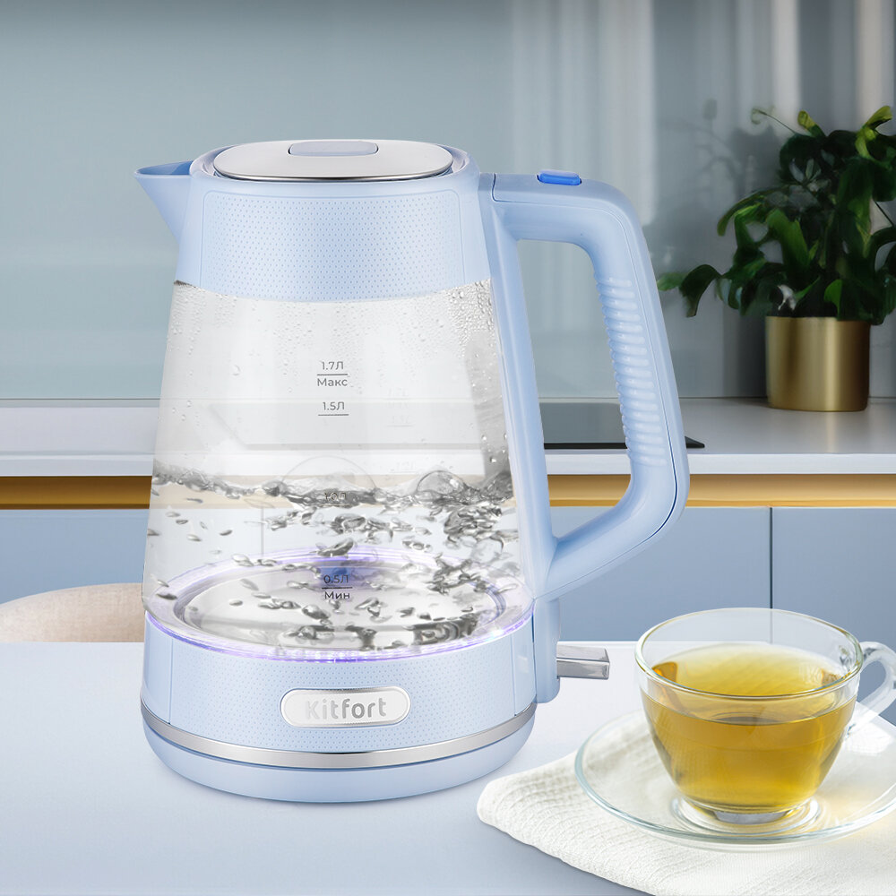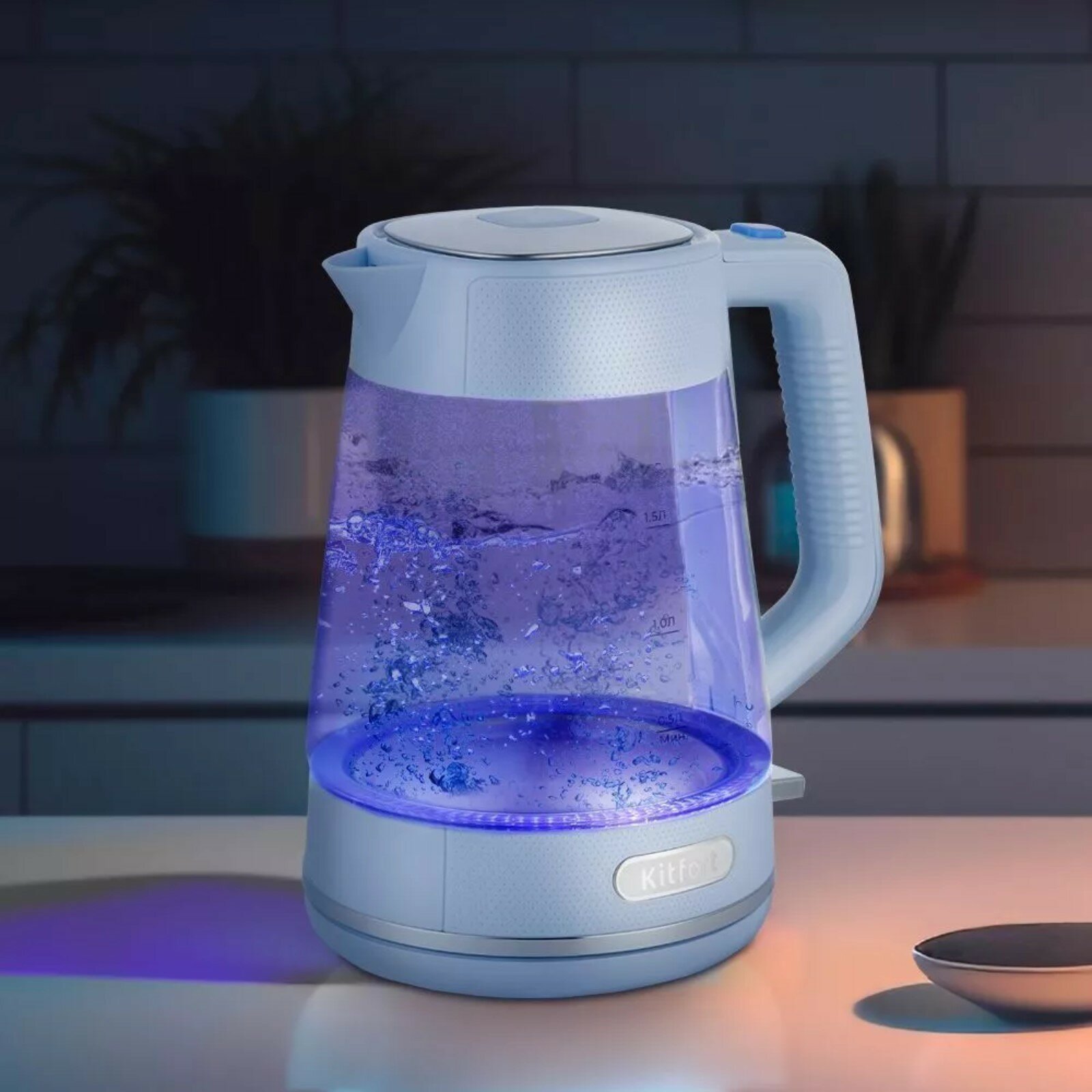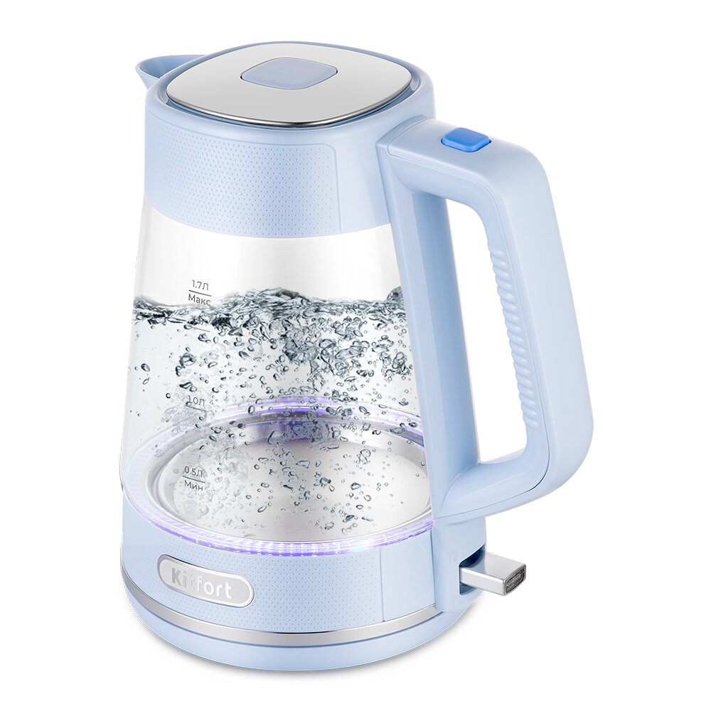 Электрический чайник Kitfort КТ-6623 предназначен для кипячения воды дома, в офисе, на даче. Полный чайник закипает примерно за 5 минут. Благодаря своему стильному дизайну чайник дополнит любой интерьер. Корпус чайника выполнен из сочетания стекла, нержавеющей стали и пластика. Для того, чтобы открыть крышку, зажмите кнопку на ручке чайника. Переключатель для включения расположен под ручкой. Чайник КТ-6623 имеет широко открывающуюся крышку и большое горлышко, что облегчает доступ внутрь чайника при его чистке и во время удаления накипи. В носике чайника расположен фильтр от накипи. При включении чайника по периметру дна загорается синяя подсветка, которая является индикатором работы и одновременно художественно подсвечивает кипящую воду. Подставка с центральным контактом даёт возможность располагать на ней чайник в любом положении, обеспечивая вращение на 360°. Снизу имеется отсек для хранения шнура, в который можно смотать излишки шнура электропитания, чтобы он не мешал на столе. Если вы включите чайник без воды, защита от перегрева автоматически отключит прибор. Дайте чайнику остыть в течение 15 минут, прежде чем наполнять его.