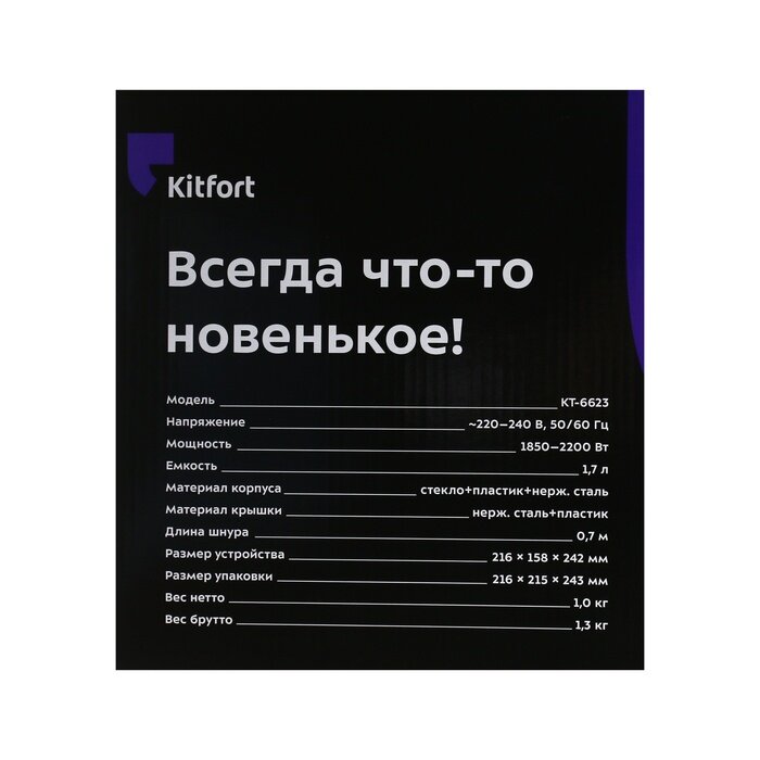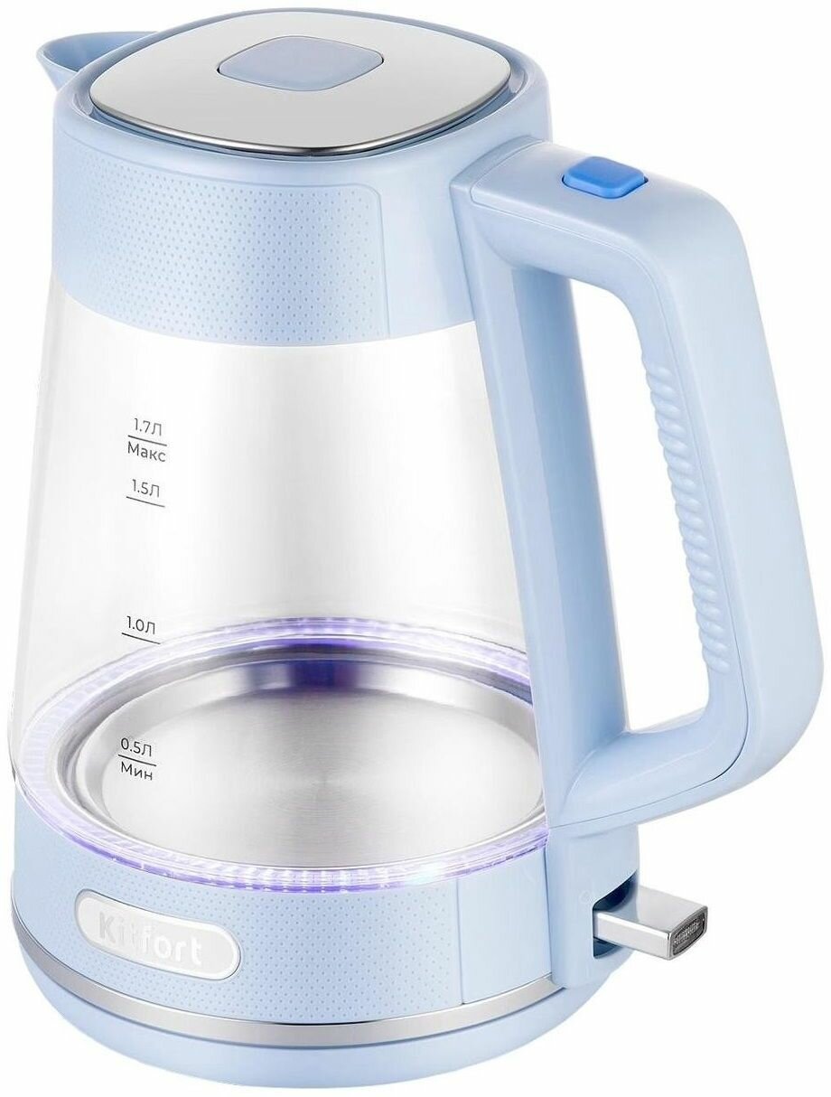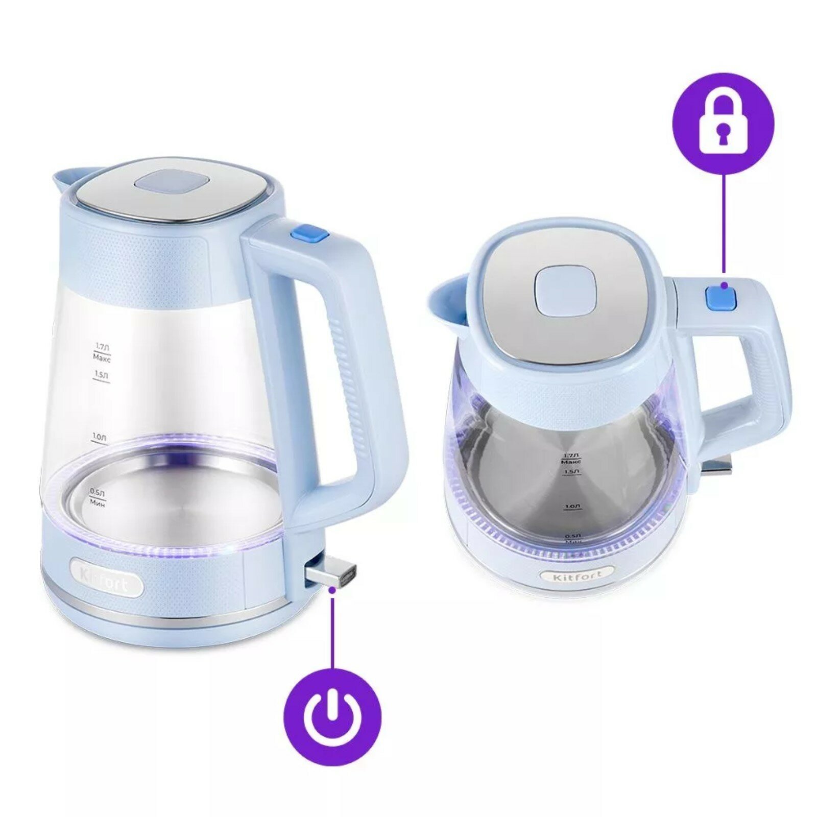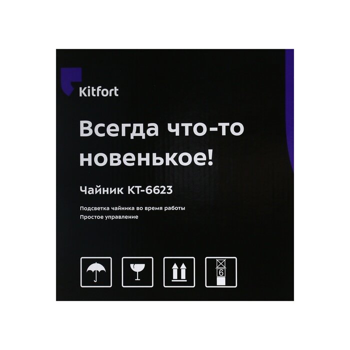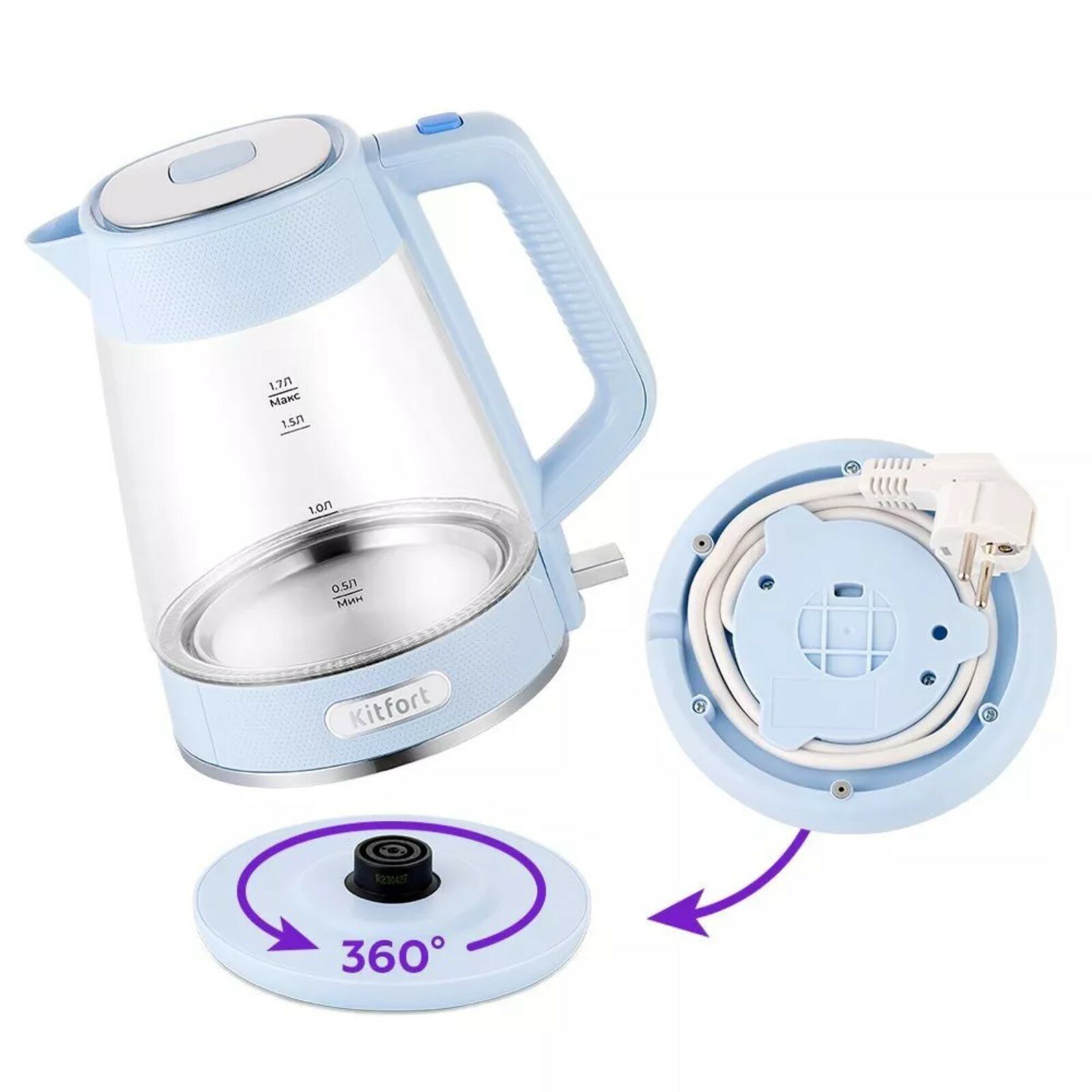 Электрический чайник Kitfort КТ-6623 предназначен для кипячения воды дома, в офисе, на даче. Полный чайник закипает примерно за 5 минут. Благодаря своему стильному дизайну чайник дополнит любой интерьер. Корпус чайника выполнен из сочетания стекла, нержавеющей стали и пластика. Для того, чтобы открыть крышку, зажмите кнопку на ручке чайника. Переключатель для включения расположен под ручкой. Чайник КТ-6623 имеет широко открывающуюся крышку и большое горлышко, что облегчает доступ внутрь чайника при его чистке и во время удаления накипи. В носике чайника расположен фильтр от накипи. При включении чайника по периметру дна загорается синяя подсветка, которая является индикатором работы и одновременно художественно подсвечивает кипящую воду. Подставка с центральным контактом даёт возможность располагать на ней чайник в любом положении, обеспечивая вращение на 360°. Снизу имеется отсек для хранения шнура, в который можно смотать излишки шнура электропитания, чтобы он не мешал на столе. Если вы включите чайник без воды, защита от перегрева автоматически отключит прибор. Дайте чайнику остыть в течение 15 минут, прежде чем наполнять его.