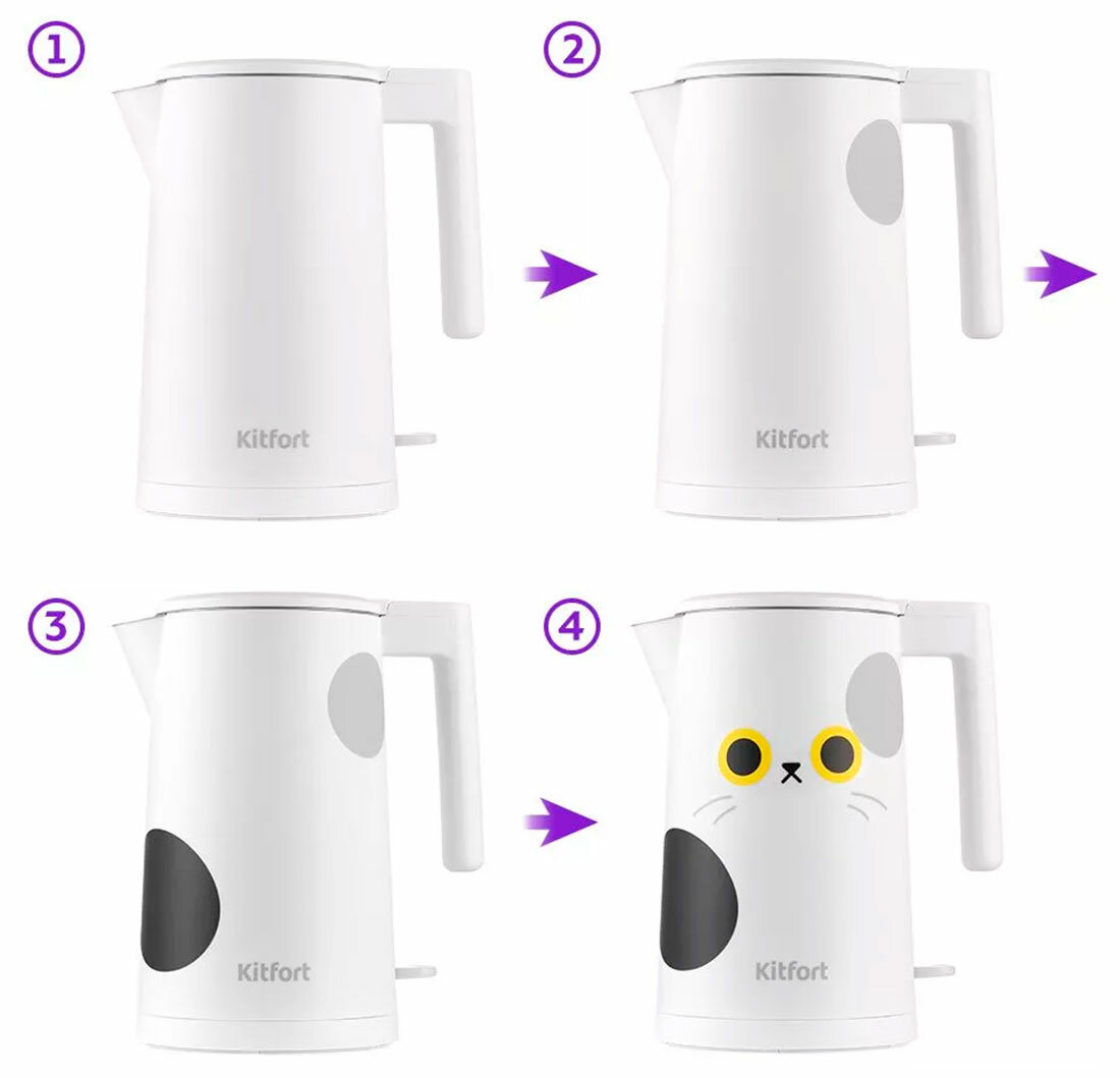 Электрический чайник Kitfort КТ-6185 предназначен для кипячения воды дома, в офисе, на даче. Ёмкость чайника 1.7 л. В комплекте с чайником идёт набор наклеек для создания образа милого котика. Каждая деталь пронумерована для соблюдения последовательности нанесения. В любой момент их можно отклеить - наклейки не оставляют следов на поверхности. Корпус чайника и крышка выполнены из сочетания пластика и металла, а подставка — из пластмассы. Мерная шкала в виде отметок MAX и MIN находится внутри корпуса чайника. КТ-6185 имеет большое горлышко, что облегчает доступ внутрь при мытье. Кнопка открывания крышки расположена на крышке, а кнопка включения — под ручкой. При включении кнопка загорается. Нагревательный элемент (ТЭН) у этой модели чайника скрытый и находится в донной части. Сверху он закрыт металлической пластиной из нержавеющей стали. Такая конструкция облегчает уход и значительно снижает шум при нагревании воды. Для увеличения срока службы чайника своевременно удаляйте накипь. Поместите в чайник специальное средство, залейте 0.5 л воды и доведите до кипения. После вскипятите в нем воду и слейте её. Для предотвращения накипи используйте фильтрованную воду.