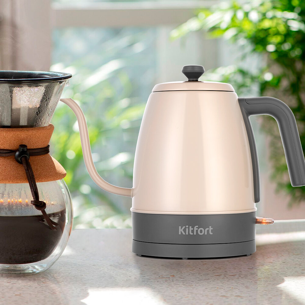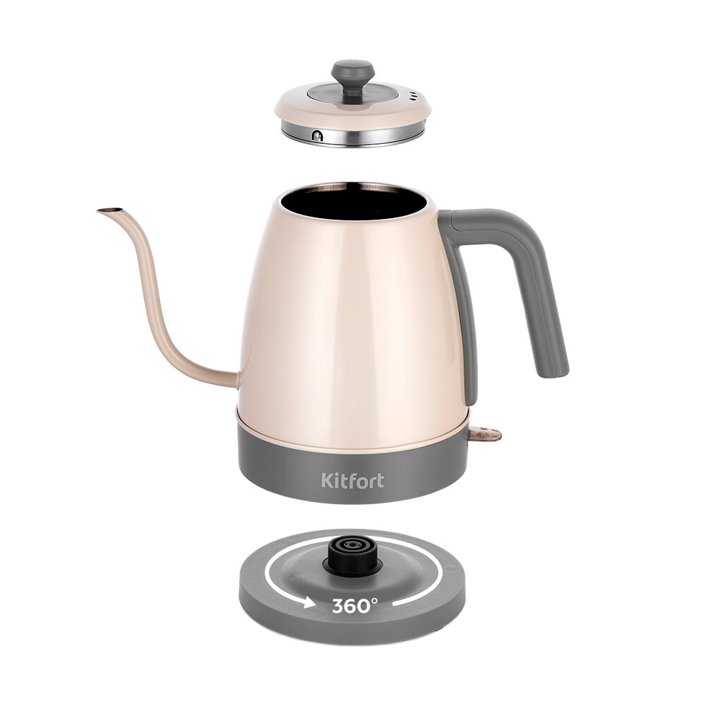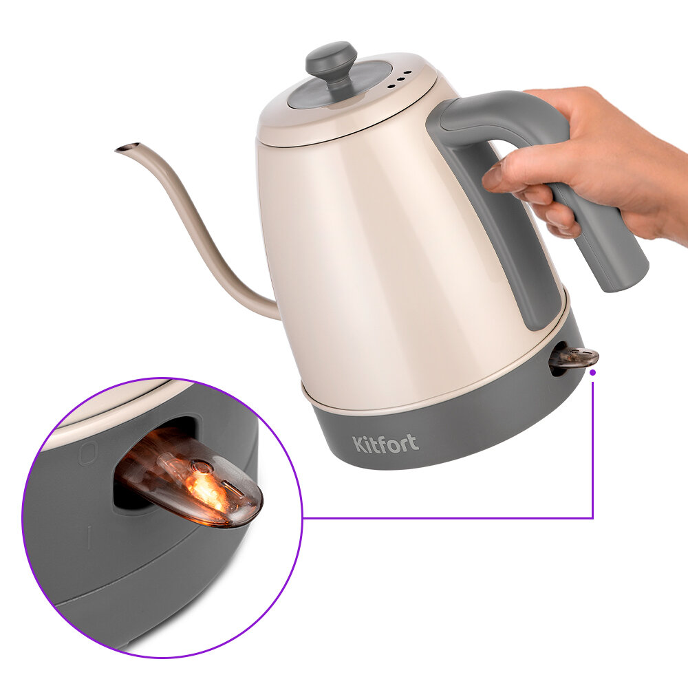 Чайник KT-6614 предназначен для кипячения воды и приготовления кофе способами кемекс и пуровер. Контролировать пролив воды с помощью обычного чайника неудобно из-за широкого носика, а длинный изогнутый носик КТ-6614 поможет вам сделать идеальный напиток. Длинный носик формирует тонкий и ровный поток воды, что является важным условием для приготовления кофе в кемексе или пуровере. Благодаря тонкому носику вы можете постепенно добавлять воду в кофе, добиваясь равномерной экстракции и раскрывая вкус кофе. Корпус и крышка выполнены из нержавеющей стали и пластика. Ручка чайника пластиковая, не нагревается, удобно лежит в руке. Под ручкой расположен переключатель, которым осуществляется управление. Он имеет световой индикатор, загорающийся при нагреве воды. Подставка с центральным контактом даёт возможность располагать на ней чайник в любом положении, обеспечивая вращение на 360°. Снизу имеется отсек для хранения шнура, в который можно смотать излишки шнура электропитания, чтобы он не мешал на столе. Чайник выключается автоматически, когда вода закипела. При необходимости вы можете выключить чайник раньше, нажав на переключатель. Если вы включите чайник без воды, защита от перегрева автоматически отключит его.