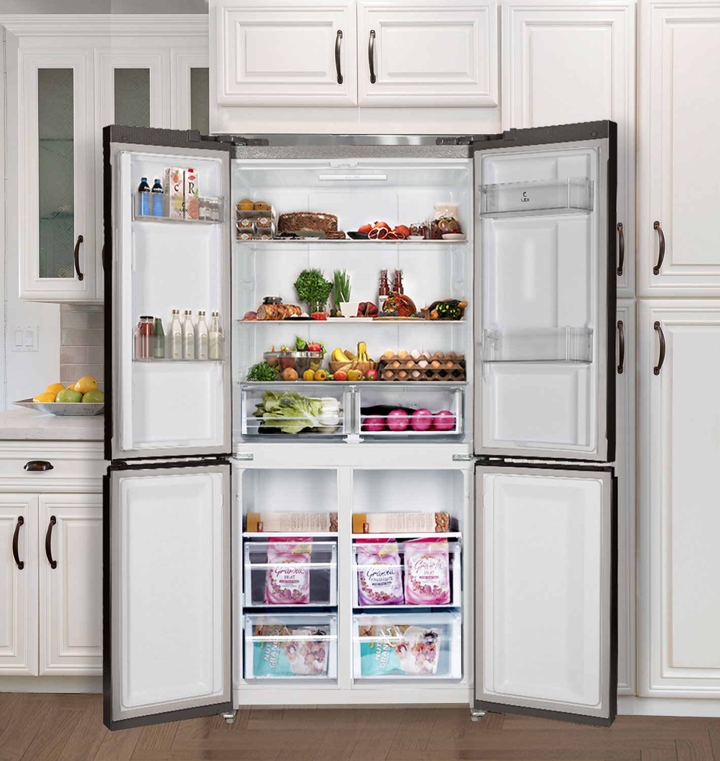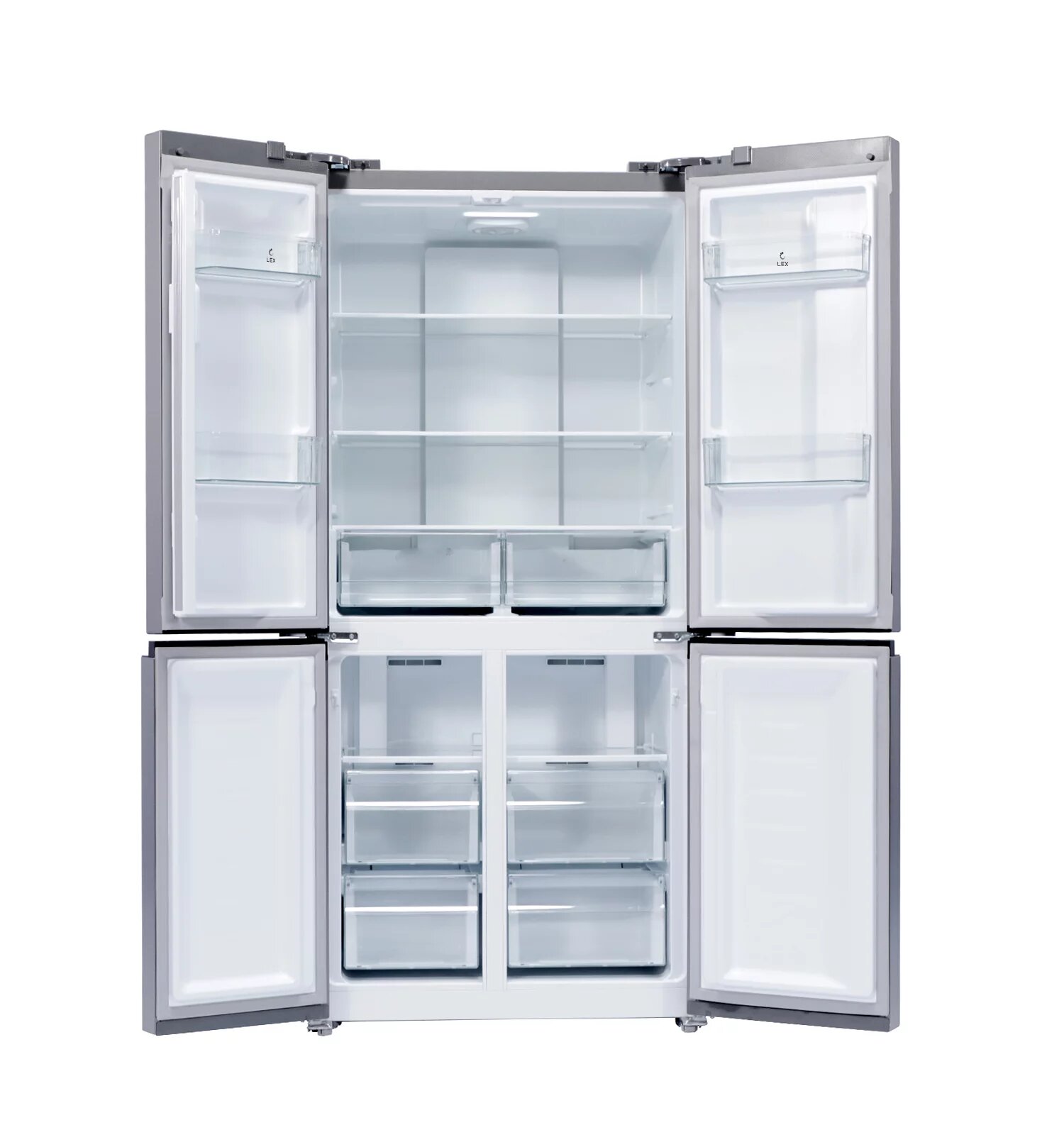 Модель LEX LCD 450 — передовые технологии и множество вариантов дизайна. Удобная панель управления и расположение дверей по типу CROSS DOOR помогут поддерживать нужные параметры хранения для каждого отделения. Холодильник с мощным, экономичным и тихим инверторным компрессором работает по технологии Total No Frost, которая не дает инею скапливаться внутри рабочих камер, значительно упрощая уход за устройством. Запатентованная многопоточная система охлаждения быстро и равномерно распределяет холодный воздух по всем зонам хранения. Модель позволяет хранить продукты при температуре от +8 °С в холодильном отделении до –23 °С в морозильном. А в режиме суперзаморозки можно установить еще более низкое значение: –28 °С. Суперрежимы позволяют максимально охладить содержимое во всех отделениях за короткое время. Это удобно, если вы загружаете сразу много продуктов, например, после похода в супермаркет или отключения электричества. В последнем случае также может пригодиться режим поддержания температуры, который будет работать 10 часов. Еще одна полезная функция — «Отпуск»: когда она активна, в каждой камере устанавливается температура, оптимальная одновременно и для сохранения свежести продуктов, и для уменьшения расхода электричества. Для этого холодильника можно выбрать один из шести стилей матового или глянцевого, стеклянного или металлического корпуса в разных цветах.