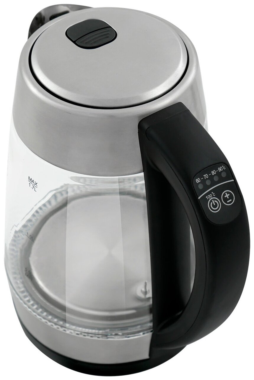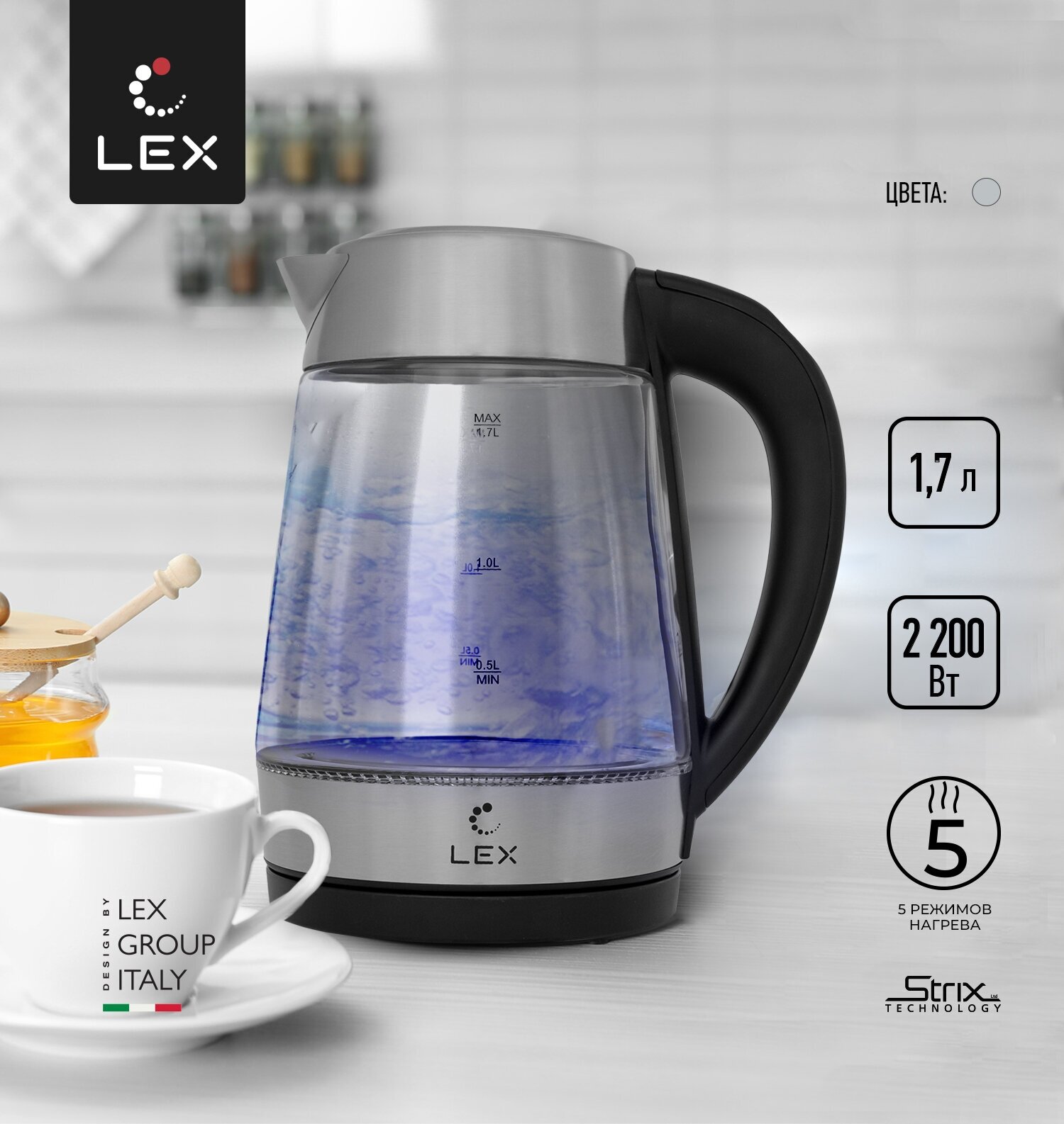 Вы любитель чая? Травяного настоя? Тогда вы наверняка знаете, что разные виды чайного листа, трав, а также ферментированный чай завариваются при разной температуре.Управление этого чайника позволяет кипятить воду до 100°С, нагревать до 60-70-80-90°С, а также поддерживать температуру.Прибор имеет ручку черного цвета с LED индикацией температуры, хромированные элементы и приятную внутреннюю подсветку, которая добавляет декоративности пространству кухни. Индикатор загорается, только когда чайник включен.Модель рассчитана на 1,7 л воды. Удобный носик для налива воды и современный эргономичный дизайн делают эксплуатацию простой и комфортной. Крышка плавно открывается и плотно закрывается, что важно, когда прибор находится в рабочем режиме.Для изготовления электрочайника , как и для других моделей бренда LEX, использовались высококачественные материалы и термостойкое стекло. Безопасность обеспечивается за счет закрытого нагревательного элемента и автоматического отключения, когда вода достигает нужной температуры.