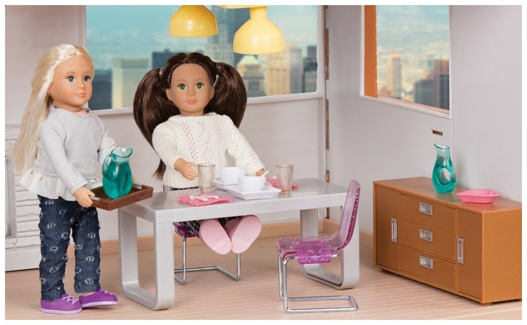 Стильный лофт с оборудованной кухней для кукол Lori с высокой детализацией: включается свет. Встроенная кухня с двумя барными стульями для завтрака станет отличным местом отдыха Lori и ее друзей. На крыше есть поляна. В доме несколько комнат для кукол, с различными аксессуарами, окна и большие двери.