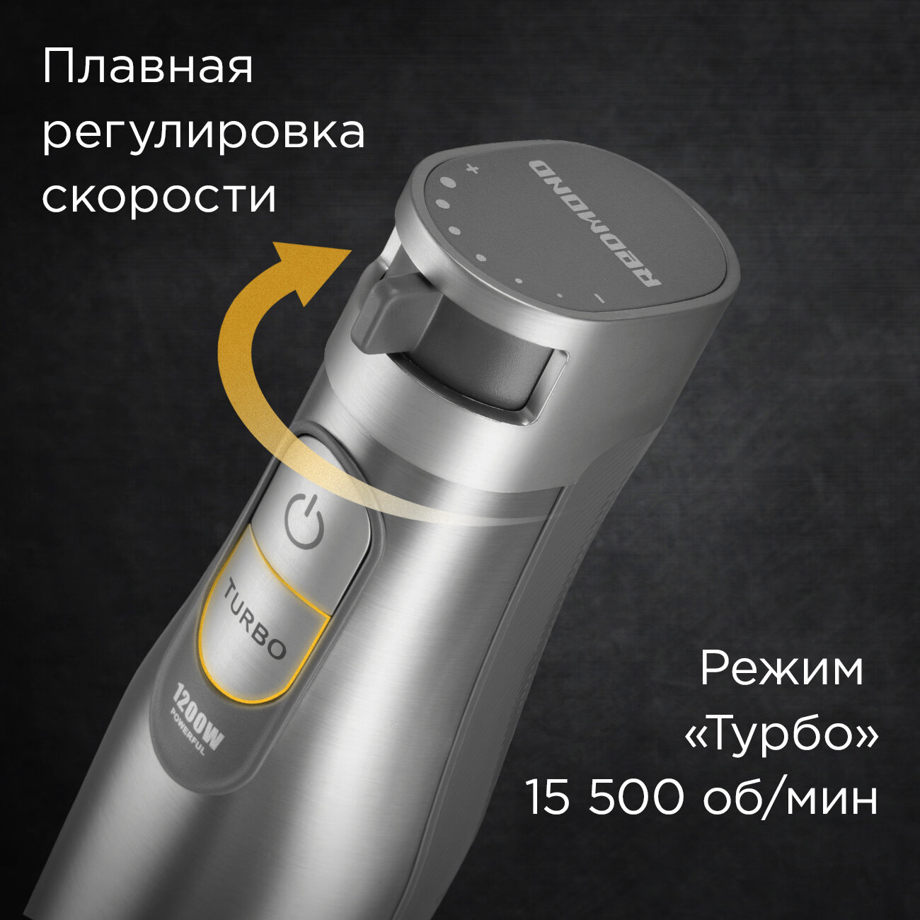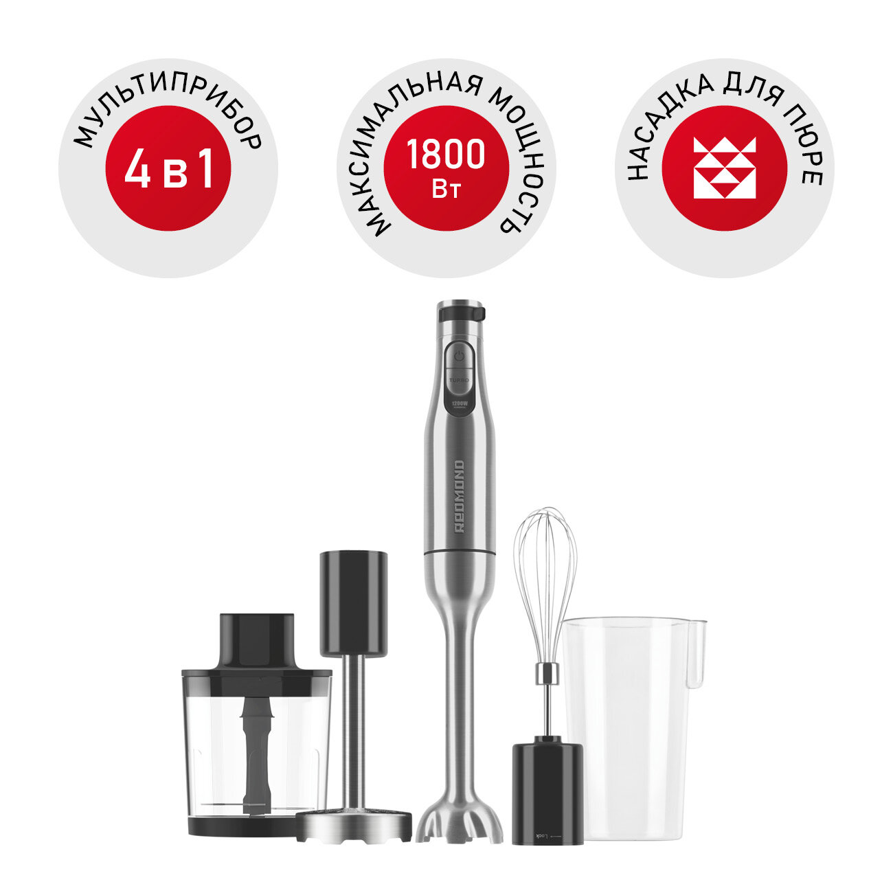 Блендер REDMOND — многофункциональный прибор, который заменит миксер и устройство для нарезки, сделает воздушное пюре и раздробит орехи. Он измельчает продукты тихо и быстро, а комплект дополнительных насадок и стакан 600 мл помогут вам воплотить любой кулинарный замысел.