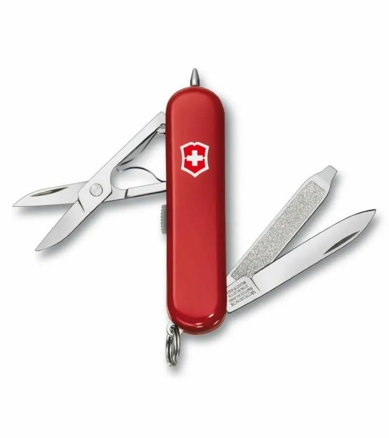 Неординарным, практичным подарком как мужчине так и женщине станет этот швейцарский складной нож-брелок от Victorinox. Модель Signature Lite характеризуется впечатляюще лаконичными размерами (длина модели в сложенном виде - всего 58 мм), приличным набором функций (целых семь!) и эталонным качеством всех инструментов, эргономично разместившихся в красной полупрозрачной рукояти складника. Нож удобно крепится на ключи и приходит на помощь в различных житейских ситуациях.