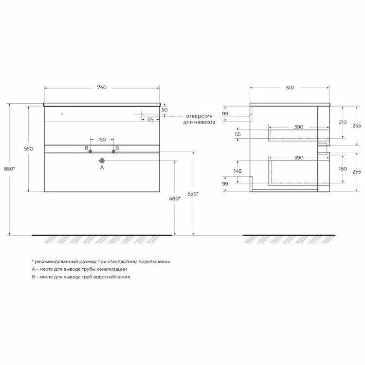 - Габариты корпуса тумбы (ШхВхГ): 740х550х510 мм.