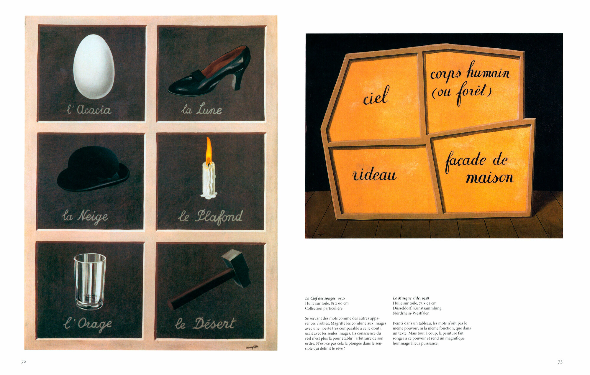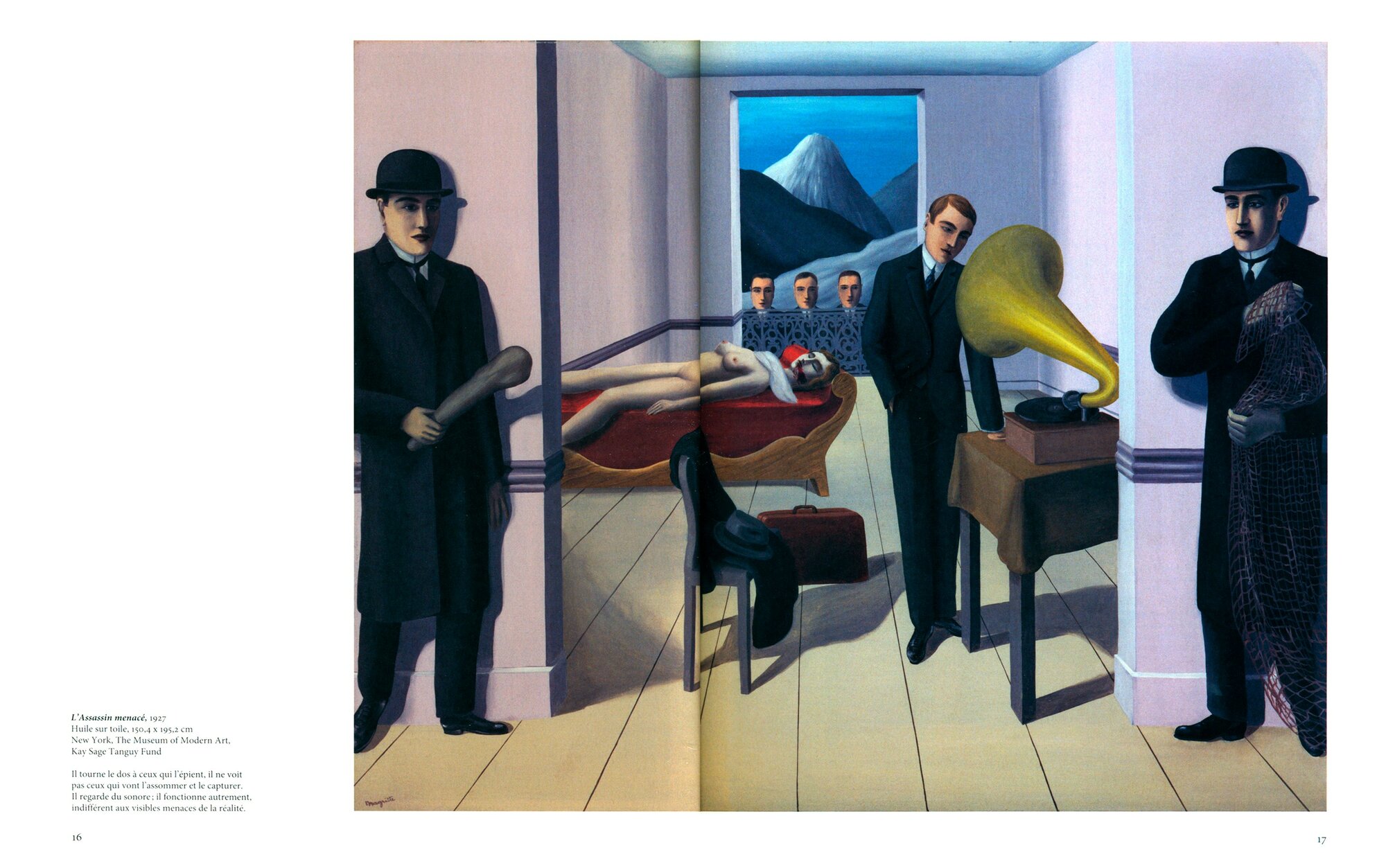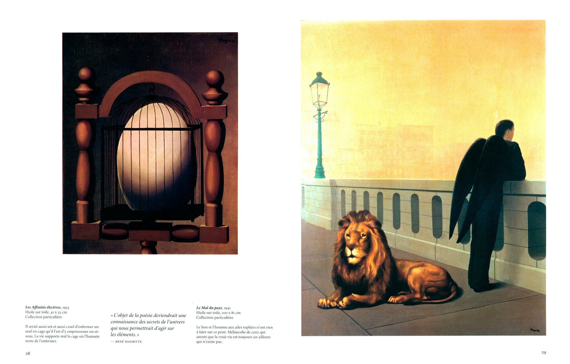 Comme d’autres ?uvres surrealistes, les tableaux de Magritte allient une technique precise et mimetique a des configurations anormales et alienantes qui defient les lois de la proportion, de la logique et de la science : un peigne de la taille d’une armoire, des rochers flottant dans le ciel, des nuages qui entrent par une porte ouverte. Le tout cree un univers direct mais deconcertant, souvent drole et souvent troublant qui nous pousse toujours au-dela du visible, vers «ce qui est cache par ce que l’on voit».