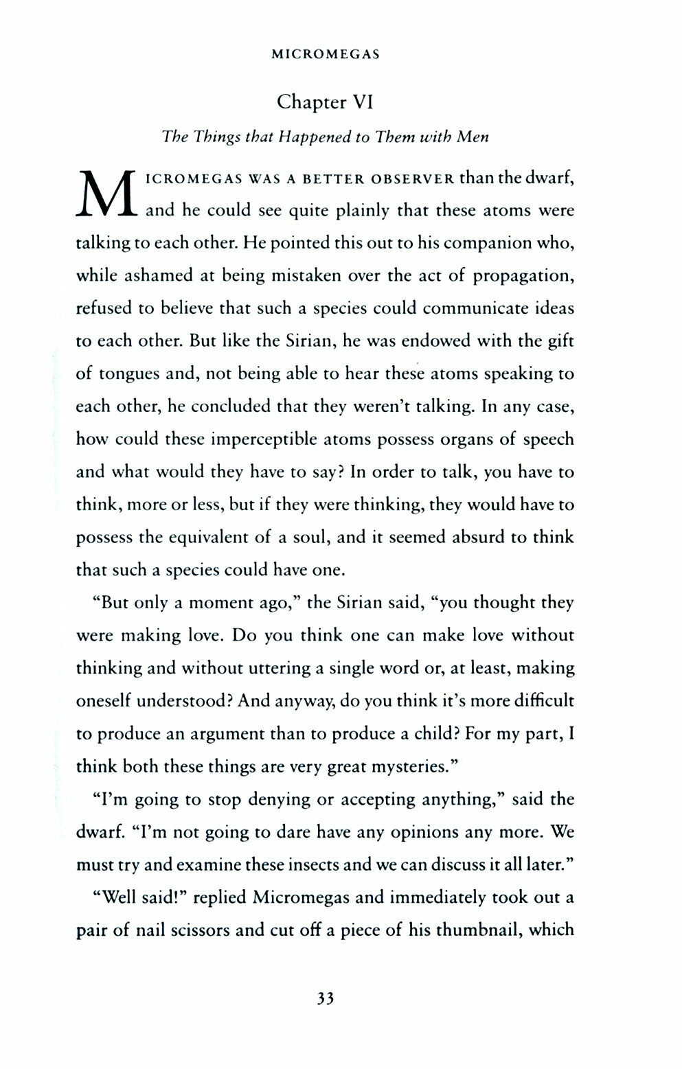 Micromegas is a six-hundred-and-fifty-year-old, thirty-nine-kilometre-high giant from the planet Sirius who can speak a thousand languages and has been expelled from his homeland for writing a heretical tract. On Saturn he befriends the local secretary of the Academy of Sciences – a comparative dwarf, being only two kilometres high – and the two decide to travel to earth together, where they will make startling discoveries about human nature.