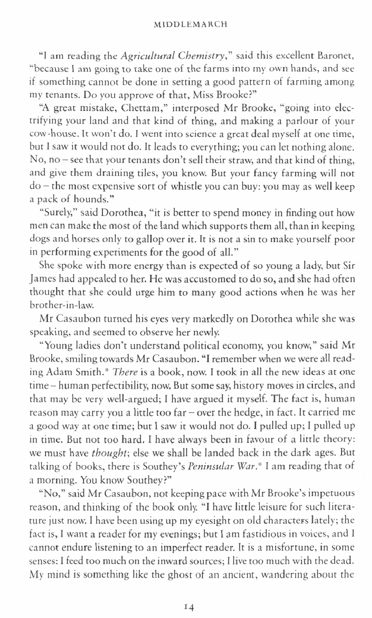 The most ambitious narrative of nineteenth-century realism, Middlemarch tells the story of an entire town in the years leading up to the Reform Bill of 1832, a time when modern methods were starting to challenge old orthodoxies. Eliot’s sophisticated and acute characterization vividly brings to life the town’s inhabitants – including the young idealist Dorothea Brooke, the dry scholar Casaubon, the young, passionate reformist doctor Lydgate, the flighty young beauty Rosamond and the old, secretive banker Bulstrode – as they move in counterpoint to each other.