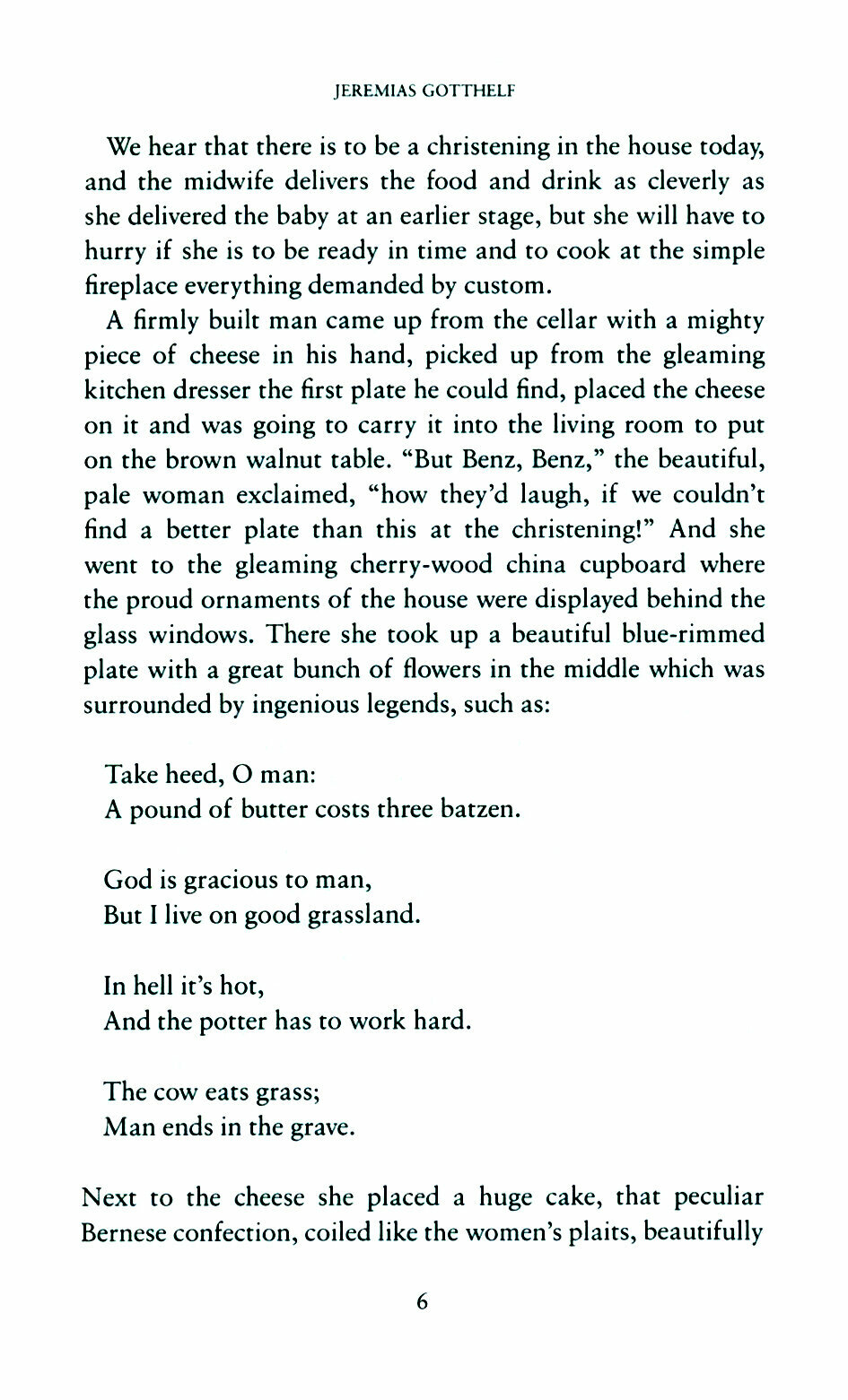 After one of their own people repeatedly fails to live up to a pact with the Devil, a petty and morally bankrupt village community is plagued by a swarm of deadly black spiders. Using a complex narrative structure, Gotthelf's cautionary novella shrewdly dissects the iniquitous social dynamics of rural life.