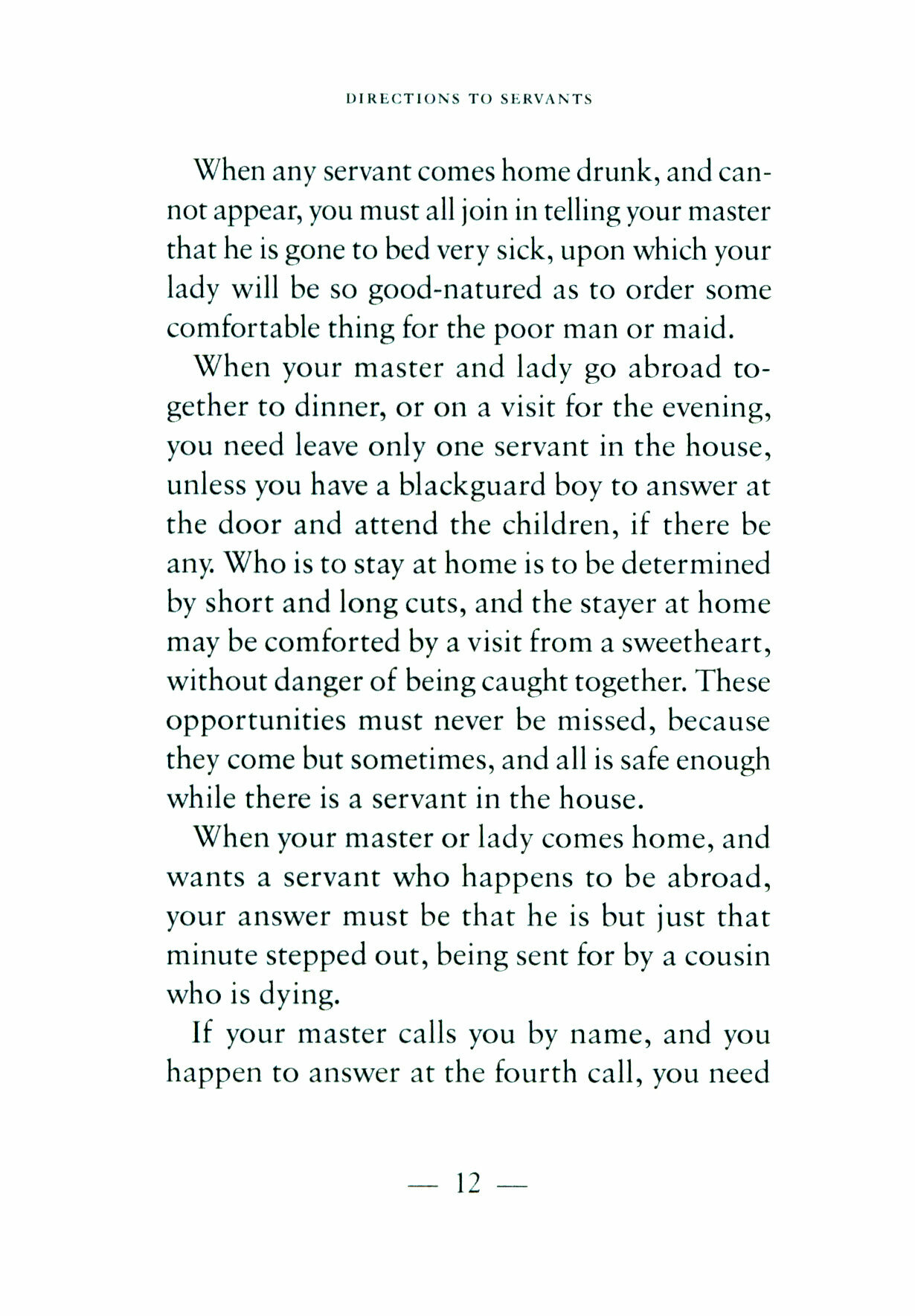 A tongue-in-cheek manual on how servants should cope with the demands of their masters and perform their tasks in ways that will best satisfy their indolence, wastefulness and greed, Directions to Servants takes a caustic and irreverent look at master-servant relations. Written towards the end of his writing career and published posthumously, this pamphlet shows Swift – who was himself known to be strict but fair to his own servants, as illustrated in the Appendix to this volume – at his witty and mischievous best.